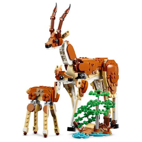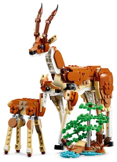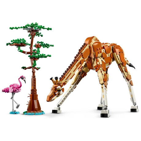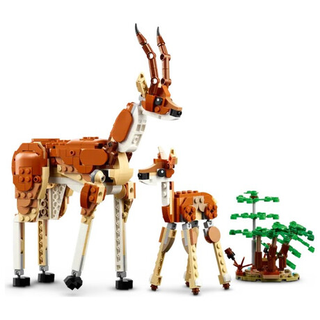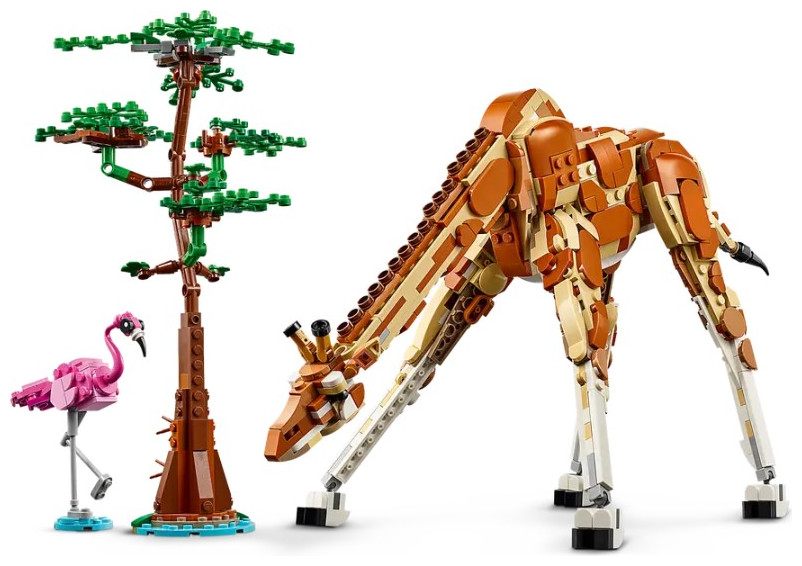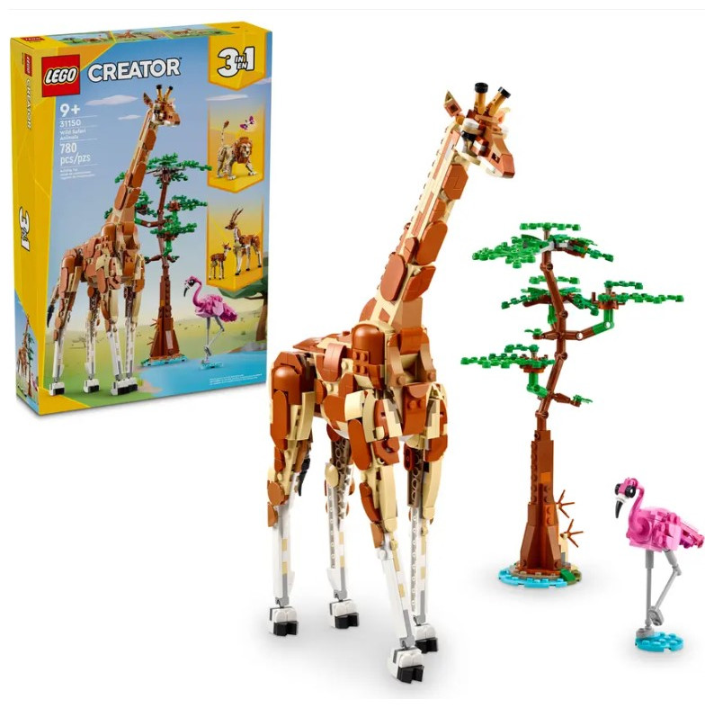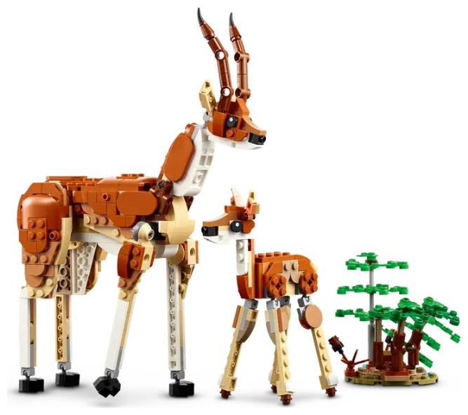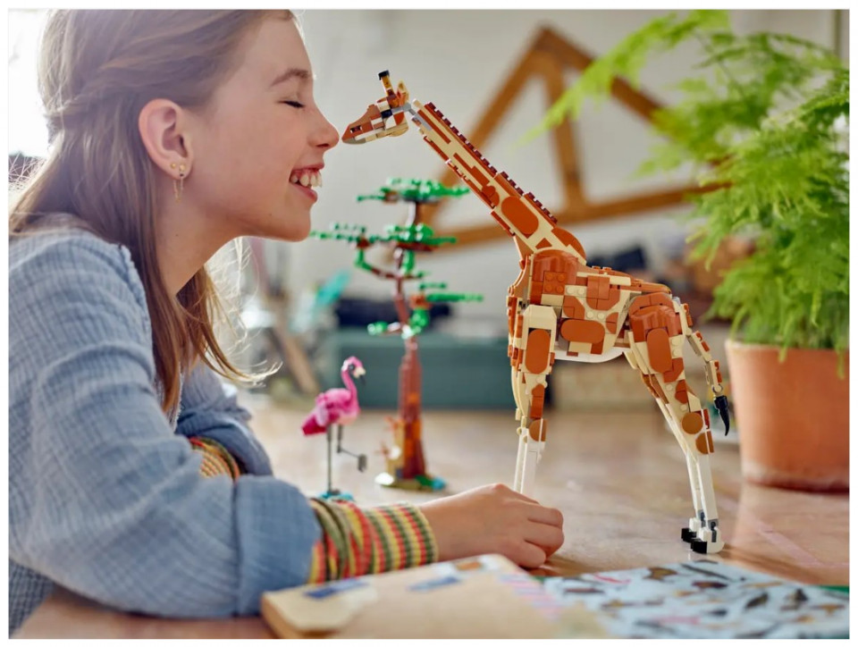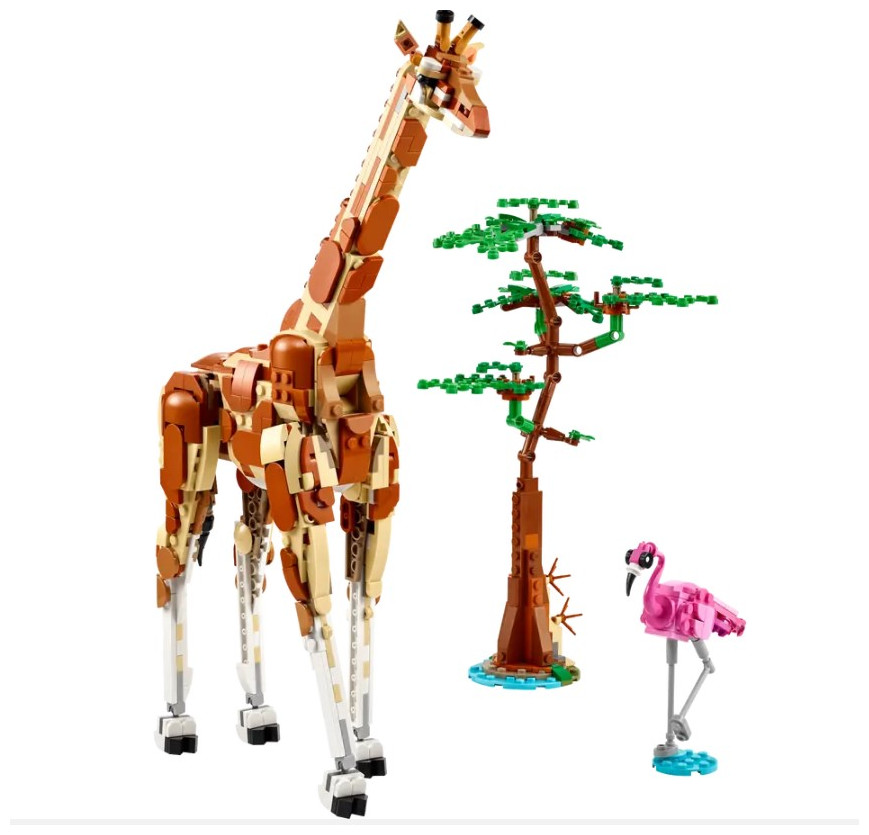 This LEGO set offers kids a world of play possibilities with 3 different animal toys to build using the same bricks. They can build a posable giraffe toy with a tree and a flamingo, rebuild it into 2 posable gazelle toys, a mother with her calf, plus 2 bushes, or turn it into a lion toy with a tree and a butterfly.
