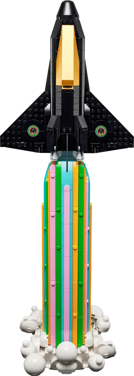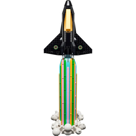 The model space shuttle has an opening cockpit and comes with attachable landing gear, which can be fitted when the vehicle is detached from the jet-stream display stand. Each of the 2 minifigures has a titanium-coloured space suit with printed detailing, plus a space helmet with an opening gold-coloured visor.