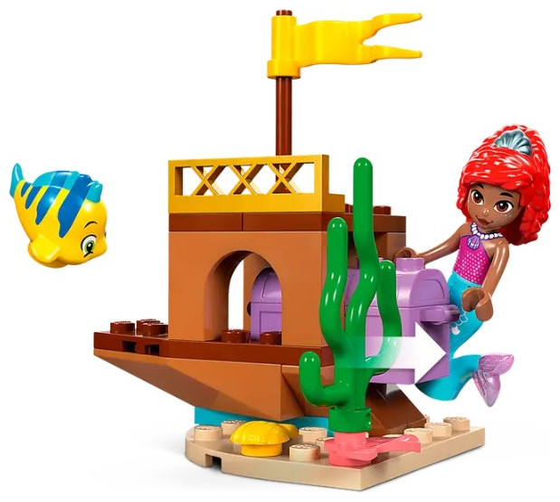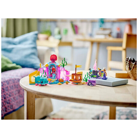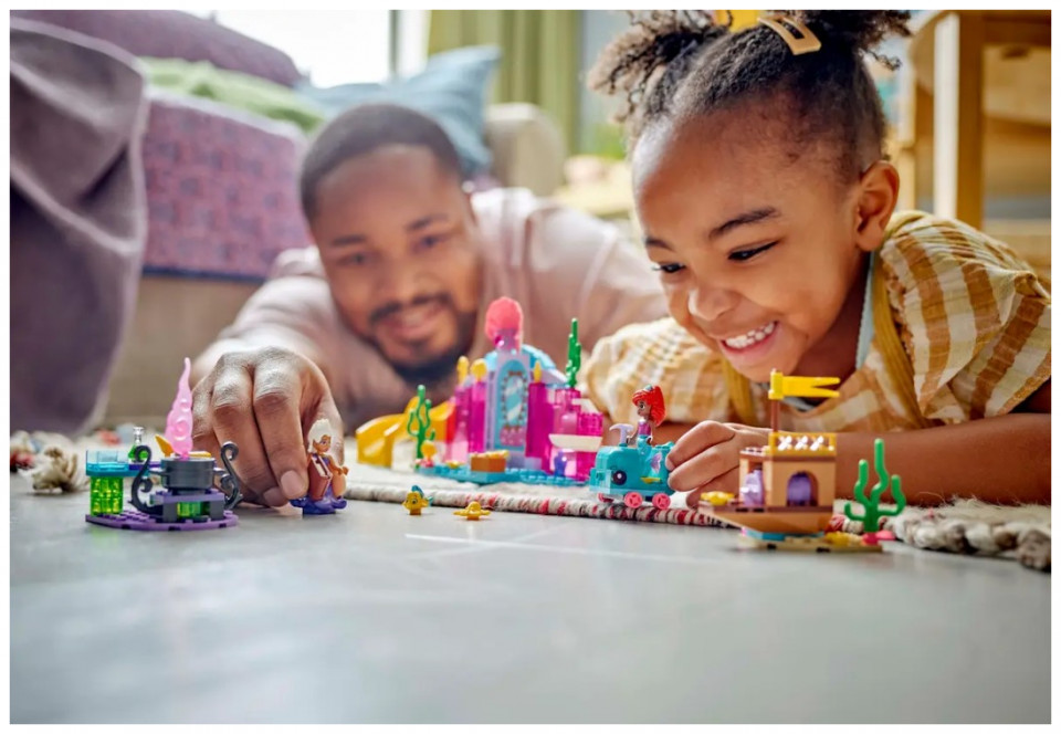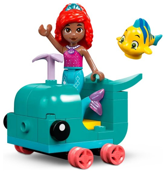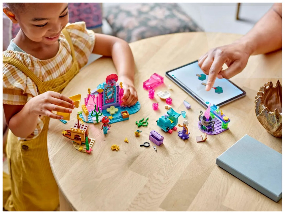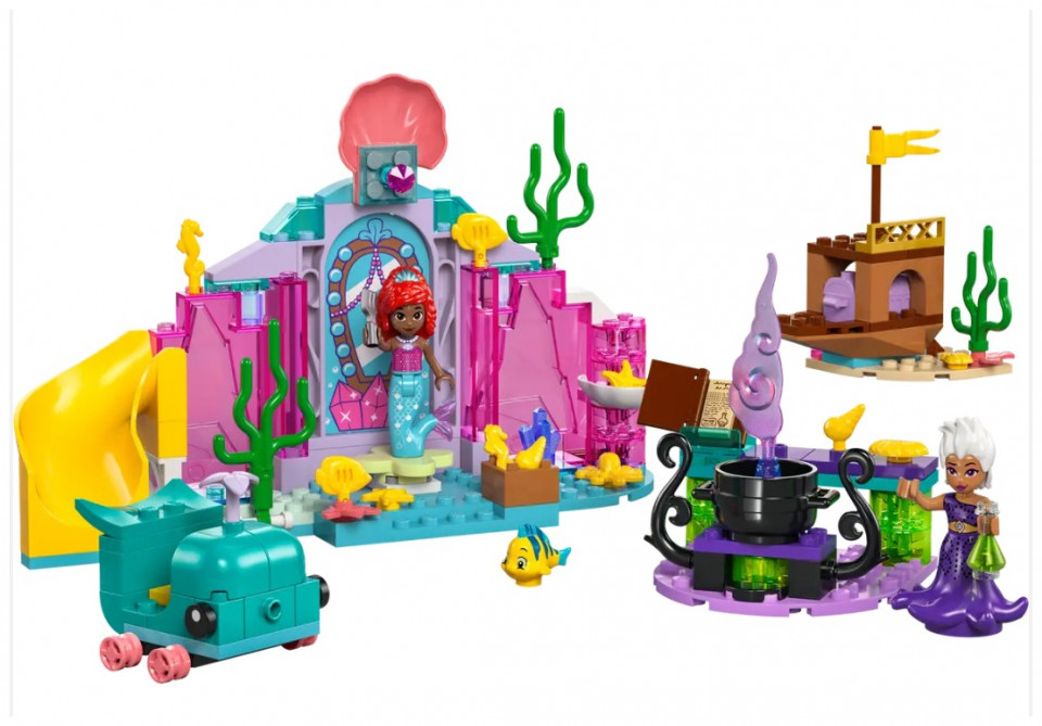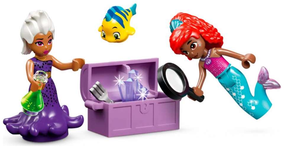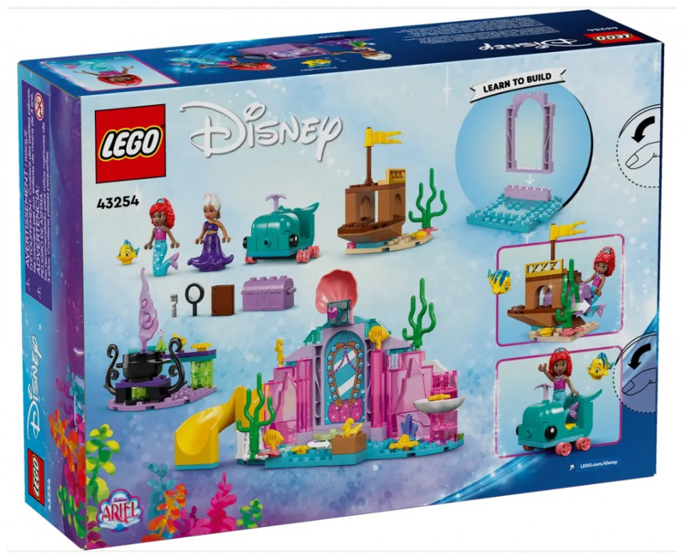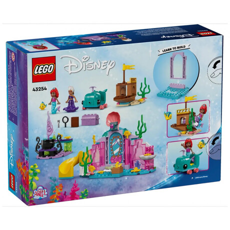 Exploration and play awaits kids aged 4+ as they learn to build with this LEGO® ǀ Disney Princess Ariel’s Crystal Cavern (43254) building toy. This buildable mermaid playset gift helps boost kids’ problem-solving skills with creative play. Inside is a cavern with a spinning platform and slide, a whale vehicle, a shipwreck with a treasure chest and a cauldron. It also includes Ursula and Ariel LEGO ǀ Disney mini-doll figures and a Flounder LEGO ǀ Disney fish figure.