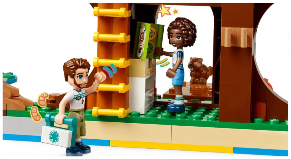 The building set is filled with fun features for creative play and comes with 5 mini-dolls, accessories and lots of animal figures, including 2 beavers who are building a dam. Send the characters whizzing down the zip line or help them navigate the obstacle course with its log bridge, climbing wall and trapdoors. There are also activities like canoeing, plus an island that can be reached by boat or zip line!