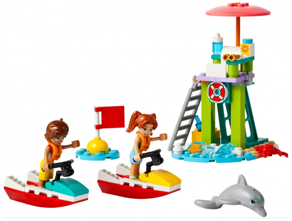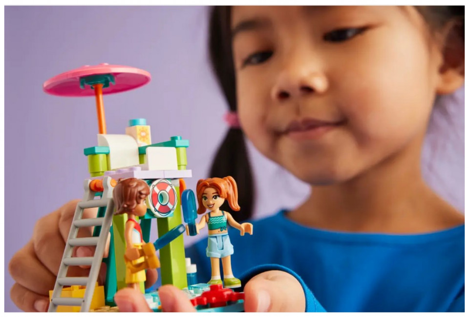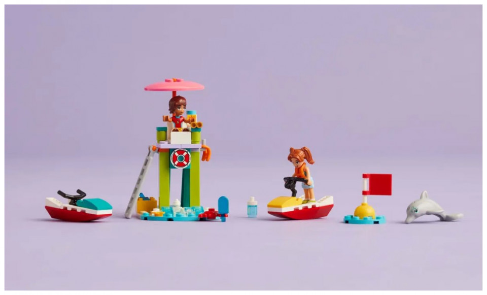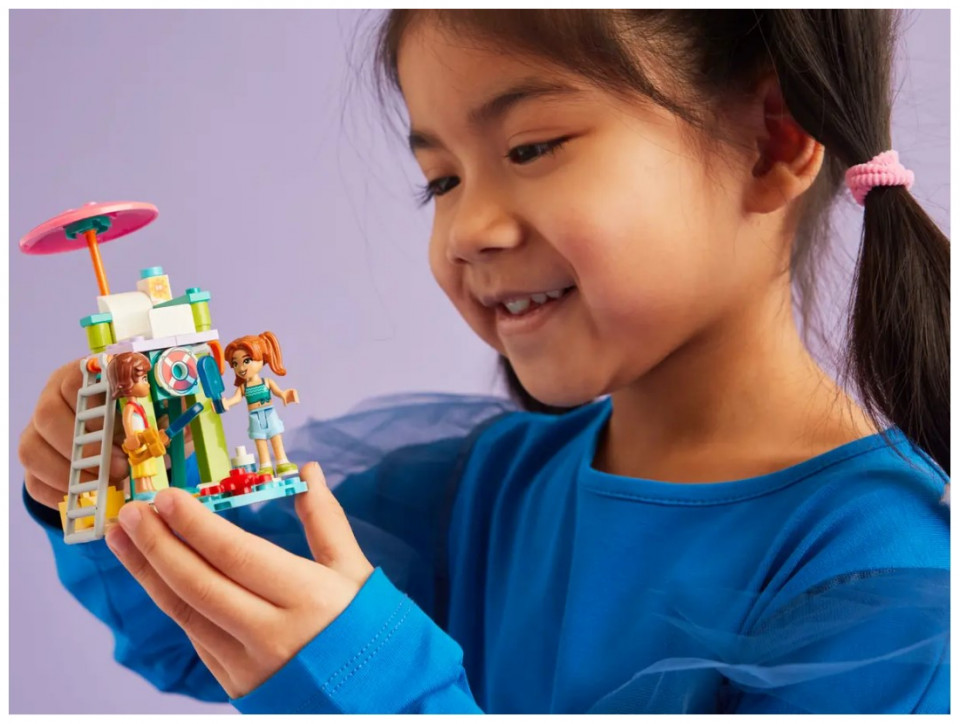 This lifeguard LEGO set comes with 2 water scooter toy accessories so kids can role-play the story. Leo is on lifeguard duty and uses the binoculars to keep watch over the ocean. It’s the perfect viewpoint for spotting dolphins too. Later he joins his friend Candi and the friends race on their water scooters. Kids will love the little details, like the cheeky crab who likes to raid the cooler for ice pops!