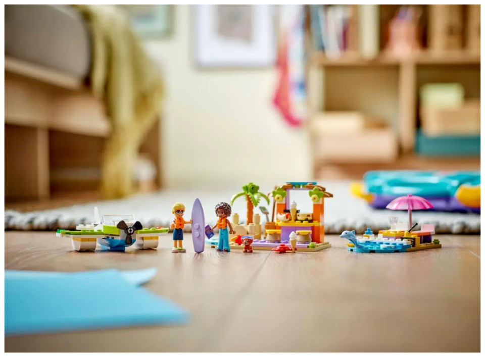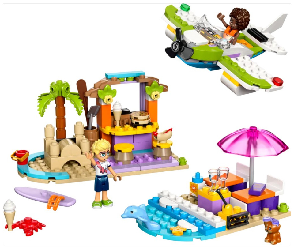 - Build, then rebuild – The set includes a beach scene with a seaplane, relaxation area and beach café hangout, which rebuilds into a new scene with a speedboat toy, an outdoor seating area and a pizza shop