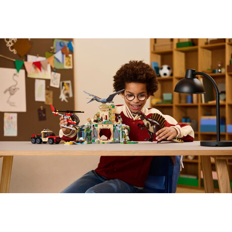 • Interactive scenery – This LEGO® Jurassic World dinosaur building kit includes a temple with a nest, a toy climbing wall, waterfall and 2 entrances, a toy helicopter and a toy truck vehicle