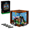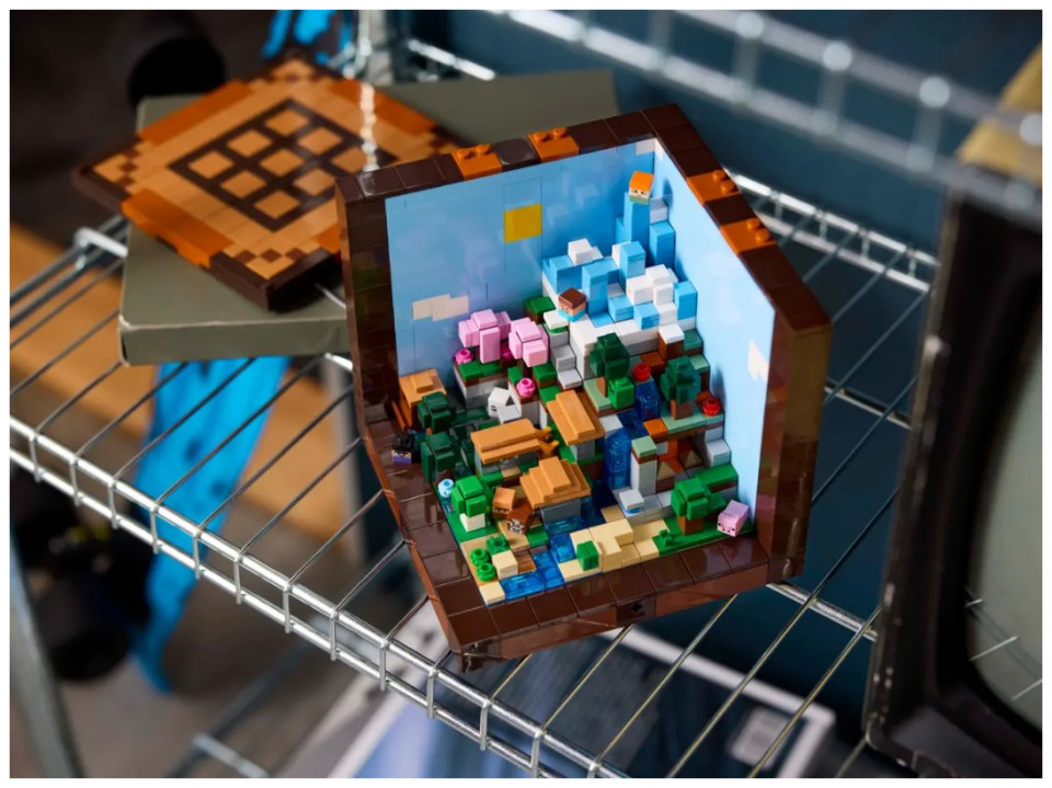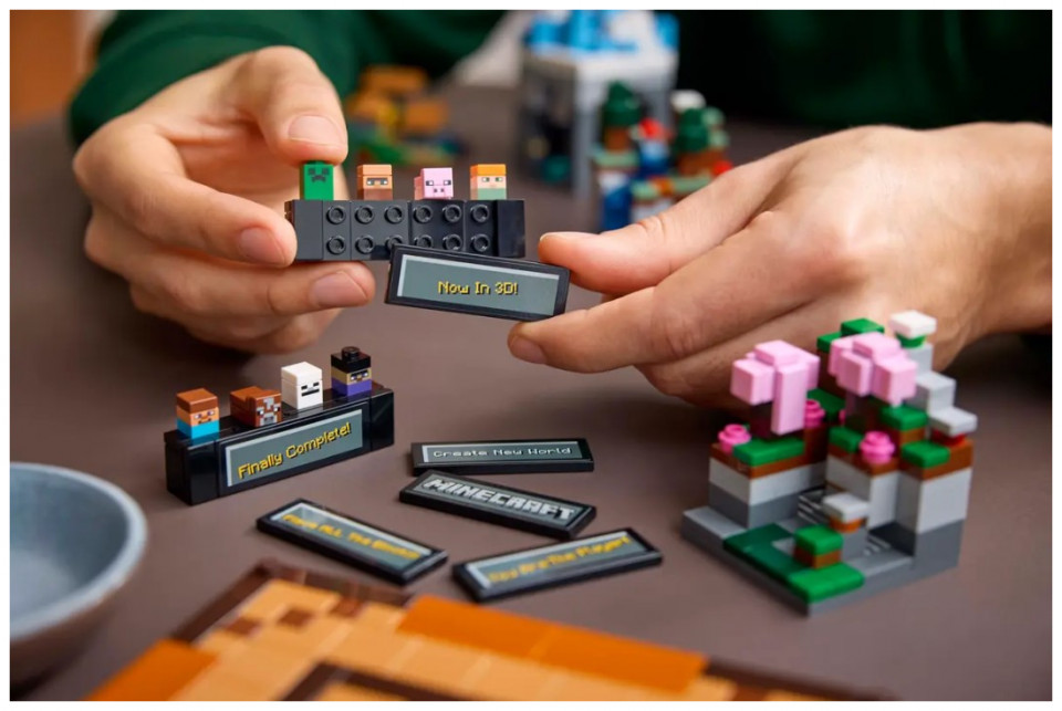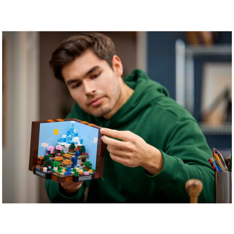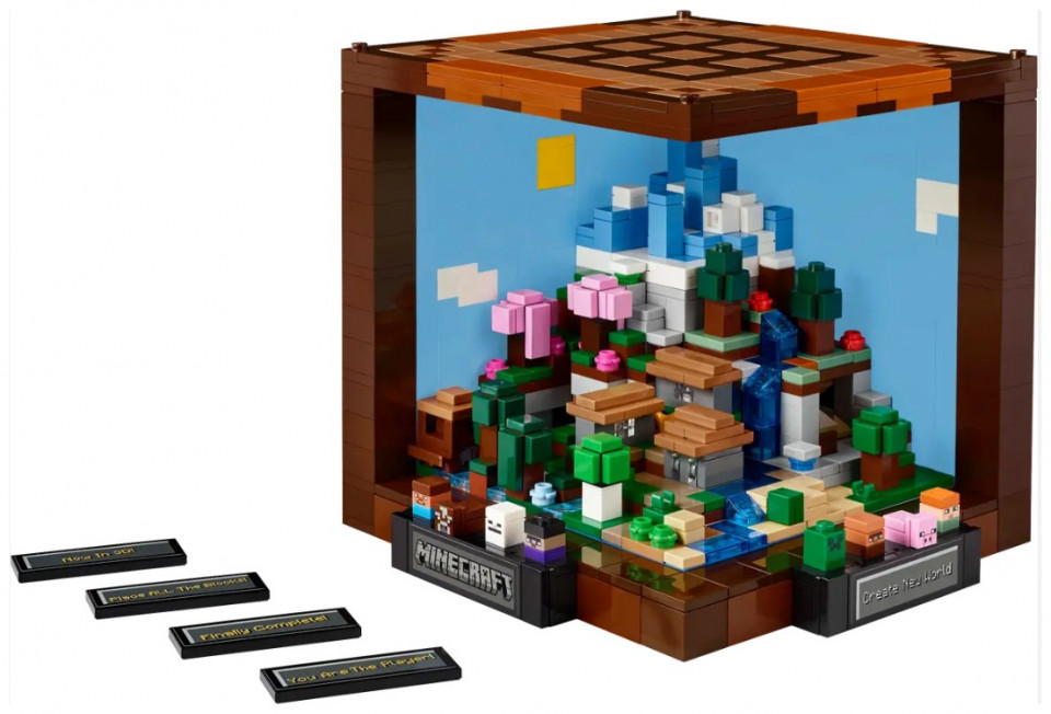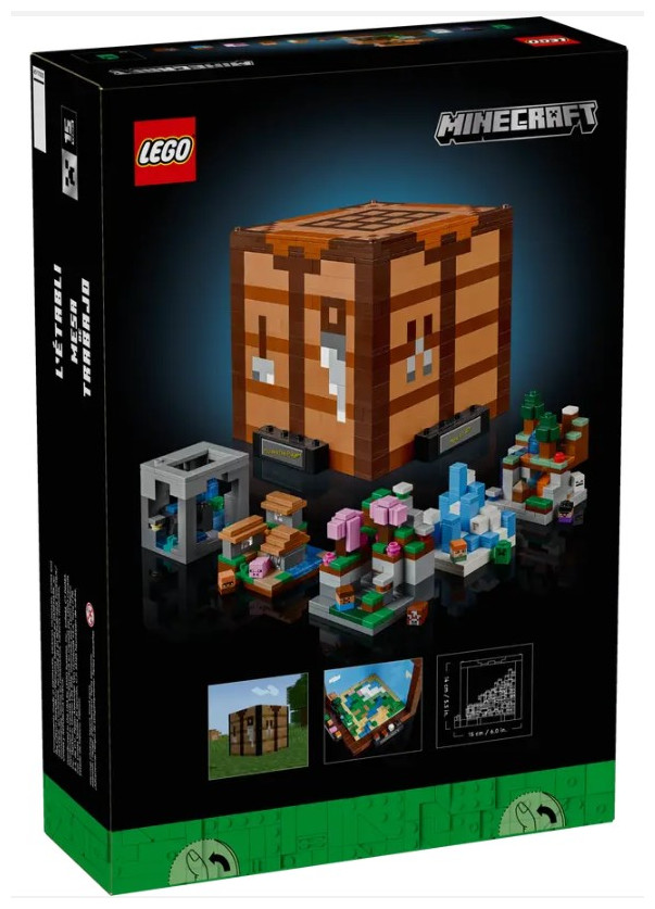 The set recreates the game’s iconic crafting table. Inside are 5 mini build modules featuring 12 Minecraft biomes, including the Taiga with a dripstone cave, Plains with a village, Ice Spikes with an igloo, Cherry Grove with an abandoned mineshaft, and the Deep Dark with a lush cave. 8 microfigures are also included: Steve, Alex, a skeleton, witch, Creeper™, villager, cow and pig. The mini builds and microfigures detach from the main model to enable a variety of display possibilities. Stickers featuring memorable in-game phrases can be added to the front of the Minecraft model. For convenience, a digital version of the set’s building instructions can also be found on the LEGO Builder app.