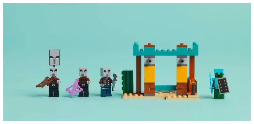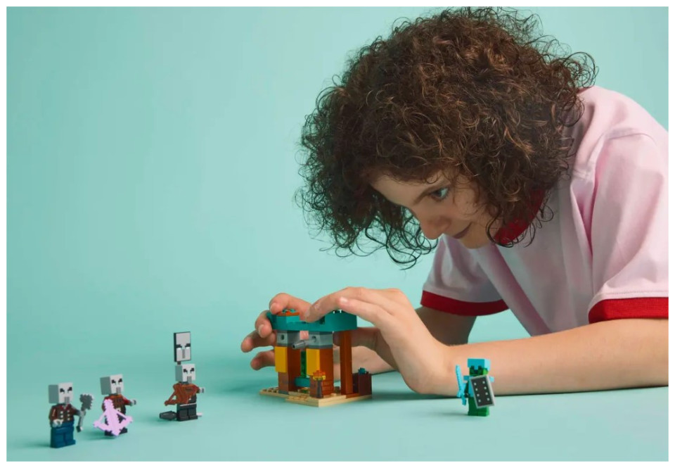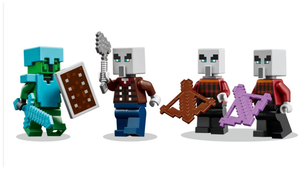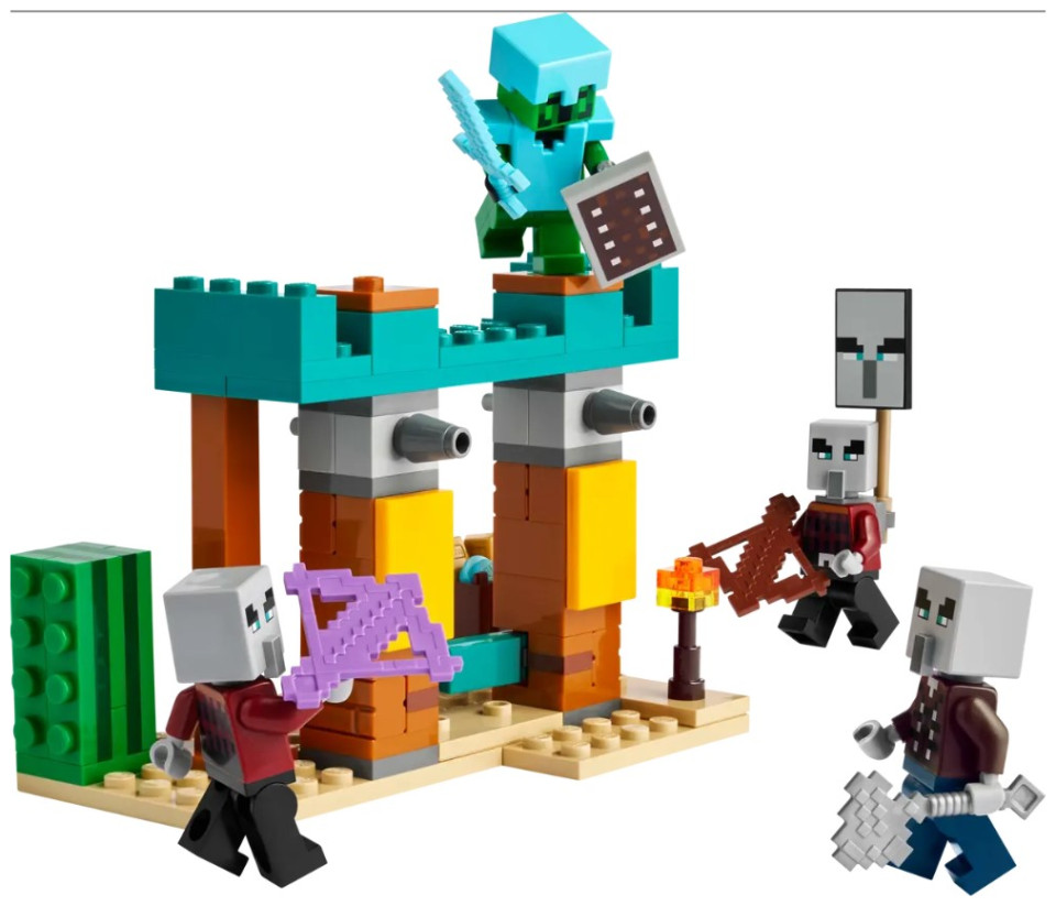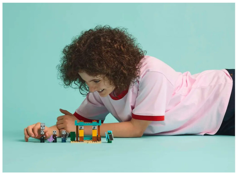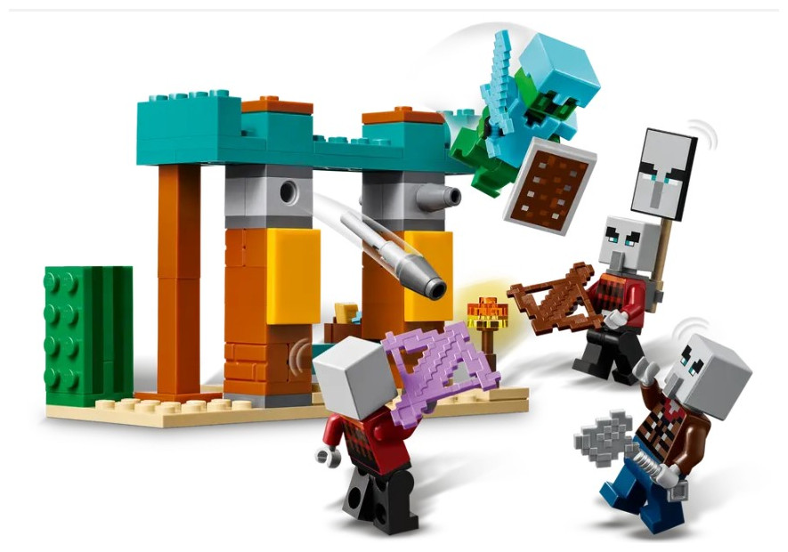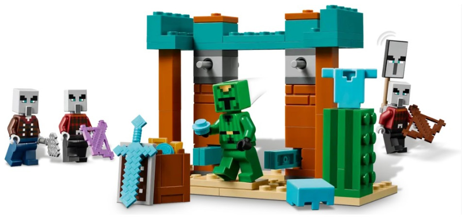 Set in a Minecraft desert outpost, kids role-play being a Cactus Knight, with its diamond armor and shield and sword. When 3 illager figures arrive to steal treasure, kids must defend the outpost. The set includes missiles that kids can launch with a flick of their finger, a variety of weapons and a barrel that holds the treasure. For extra digital fun, the LEGO Builder app lets kids zoom in and rotate models in 3D using their device.