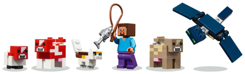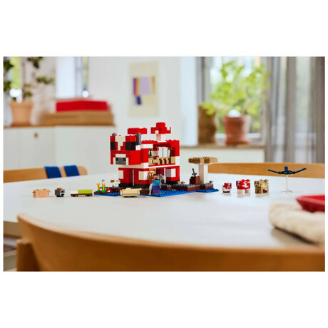 - Hands-on video game toy – Kids build a large, mooshroom-shaped house with a small farm on an island, go fishing in a boat and search for treasure