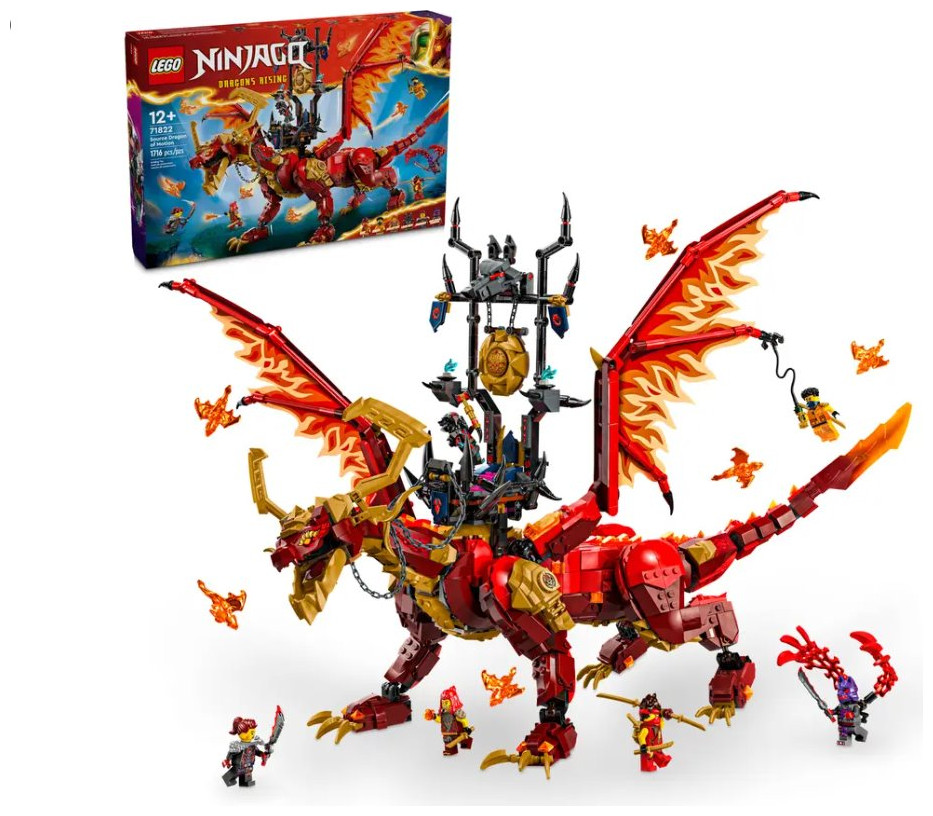 Kids aged 12+ recreate soaring aerial adventures from season 2 of the NINJAGO® Dragons Rising TV show with this awesome Source Dragon of Motion (71822) adventure toy. This is the biggest-ever LEGO® dragon toy, and has posable legs, tail, hips, jaw, head, neck and large wings. It comes with a saddle-throne on its back and 6 smaller spirit dragons.