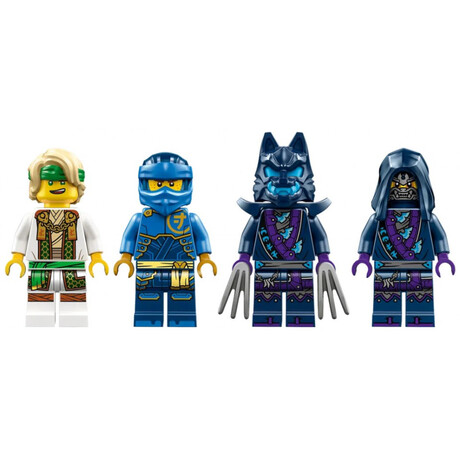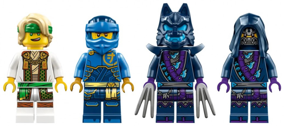 This ninja toy is packed with 4 NINJAGO minifigures and lots of accessories. Jay is armed with a golden sword and the Master Lloyd minifigure has 2 golden kat ana swords. The Wolf Mask Claw Warrior has a long set of claws on each hand and the Wolf Mask Guard comes with a crossbow.