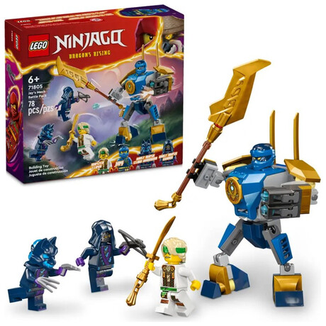 Boys and girls aged 6+ can play out all-action battle scenes from season 2 of the NINJAGO® Dragons Rising TV show with this Jay’s Mech Battle Pack (71805) adventure toy. This ninja construction toy for kids features a cool mech figure with posablearms, legs and torso that wields a large golden sword and can fire studs from its 2 shooters.