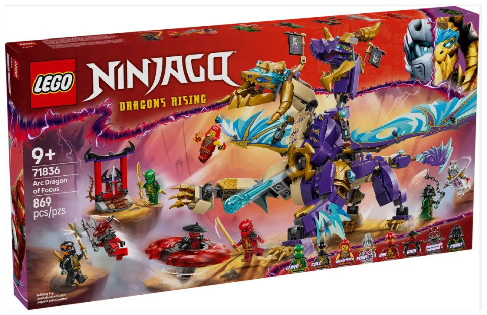 Delight boys and girls aged 9 and up with this LEGO® NINJAGO® Arc Dragon of Focus (71836) ninja toy that lets them role-play epic action scenes from season 3 of the NINJAGO Dragons Rising TV show. This building kit features a 2-headed dragon figure with posable tail, legs, feet, head, neck, jaw and claws. Kids can activate a shooter in its chest and move its large foil wings back and forth using a lever on its back. This battle playset includes 8 NINJAGO character minifigures for ninja fans to stage action-packed adventures. Find ninja warriors Lloyd, Cole, Wyldfyre and Kai, and their ally Pixal, each with a ninja weapon accessory, plus villains Drix, Zarkt and a Dragonian Warrior with their own weapons. For more play value, the LEGO set comes with a cool spinjitzu spinner vehicle. Kids can place a minifigure inside and press a button on its launcher that fires it into a rapid spin, then watch as 2 power elements possibly fly off as it hits its target.