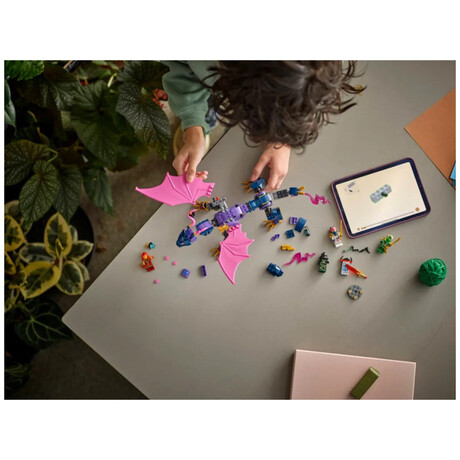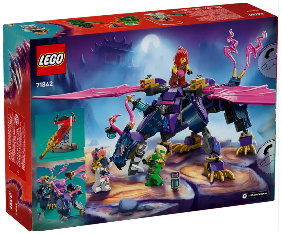 LEGO® NINJAGO® Rontu the Master Dragon (71842) toy lets ninja fans aged 7 and up recreate action-packed scenes from season 3 of the NINJAGO Dragons Rising TV show. This building set for kids features a dragon toy with a posable tail, legs, wings, head and jaw, 2 positions to place a minifigure on its back and a stud shooter under each wing.