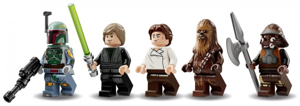 • 6 LEGO® Star Wars™ minifigures – Luke Skywalker, Han Solo, Chewbacca, Lando Calrissian, and Boba Fett with accessories, plus a LEGO Star Wars 25th anniversary minifigure of Nien Nunb