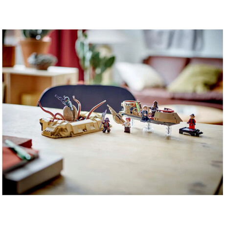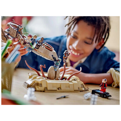 Replay a thrilling Star Wars: Return of the Jedi scene and create new adventure stories with this LEGO® brick-built Desert Skiff & Sarlacc Pit toy vehicle playset (75396) for kids aged 9 and up. The desert skiff features translucent elements for a hover effect and has playful details such as a push-out plank for Luke Skywalker to walk and the foldout railing where Han Solo nearly fell off. The pit has levers to move the Sarlacc’s tentacles, and the Sarlacc has space in its mouth for a LEGO minifigure.