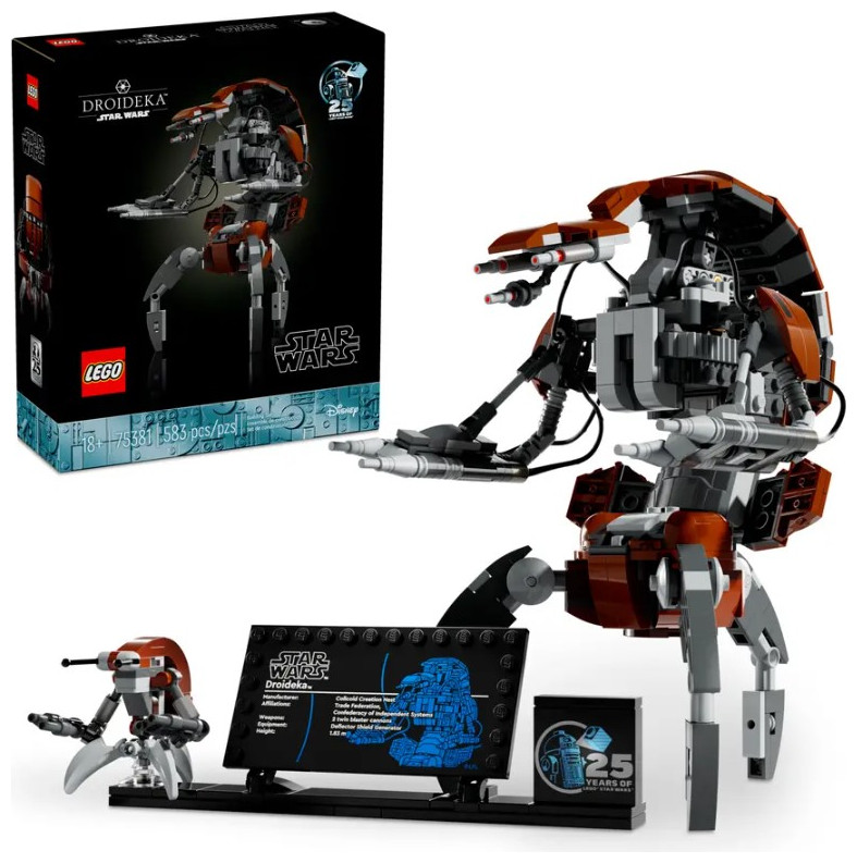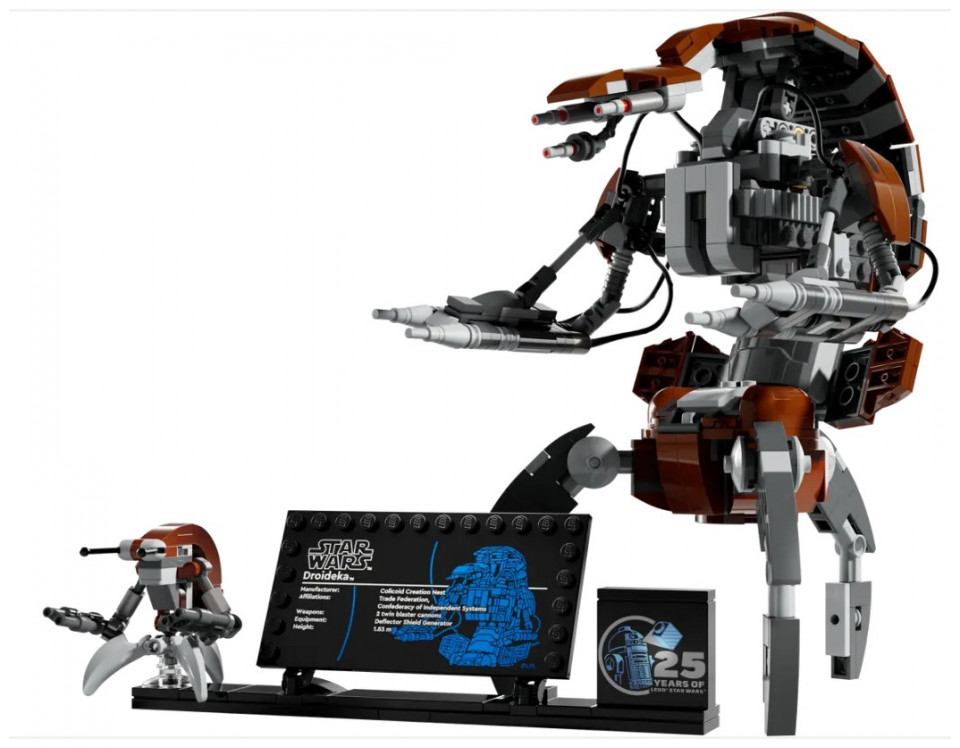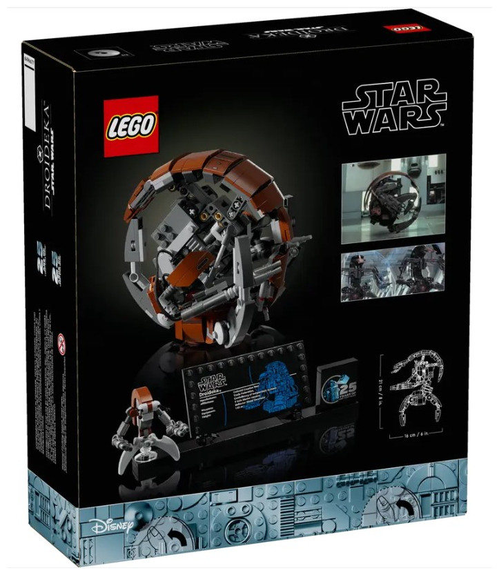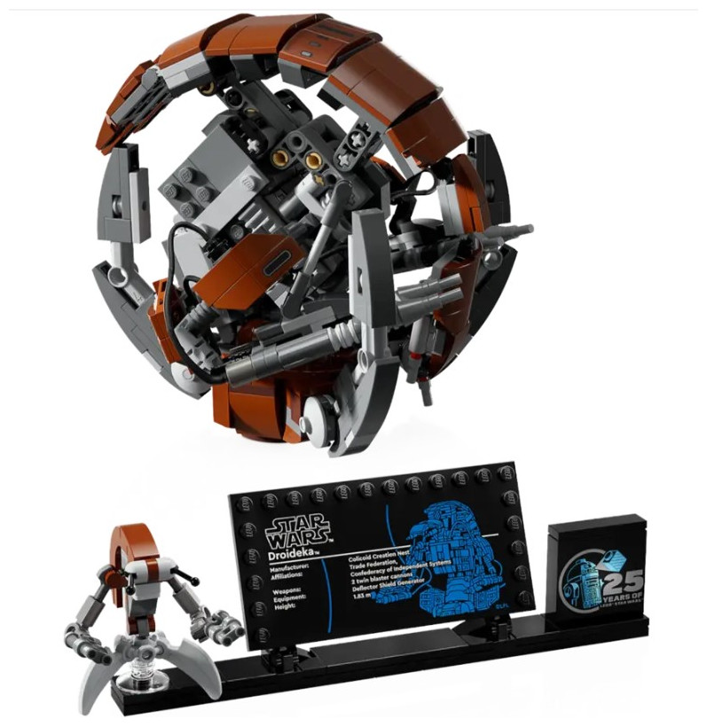 • 25th anniversary centerpiece – This unique set includes a stand with space for the small LEGO® droid figure of a Droideka, a Droideka information plaque and a LEGO Star Wars™ 25th anniversary brick