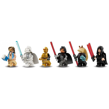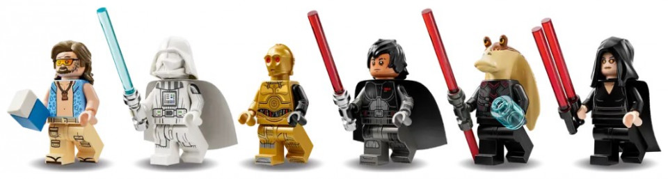 - 6 LEGO® Star Wars™ minifigures – Darth Jar Jar, Bounty Hunter C-3PO, Darth Dev, Darth Rey, Beach Luke and Jedi Vader, plus accessories including lightsabers and a blue milk carton