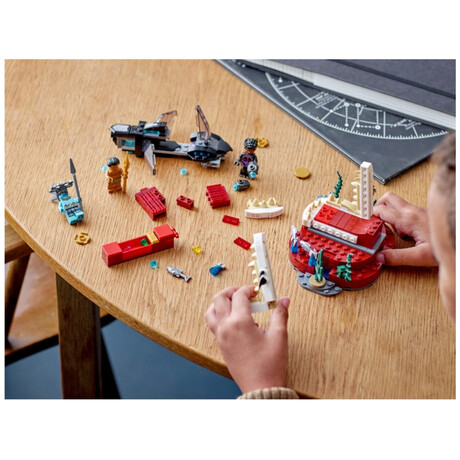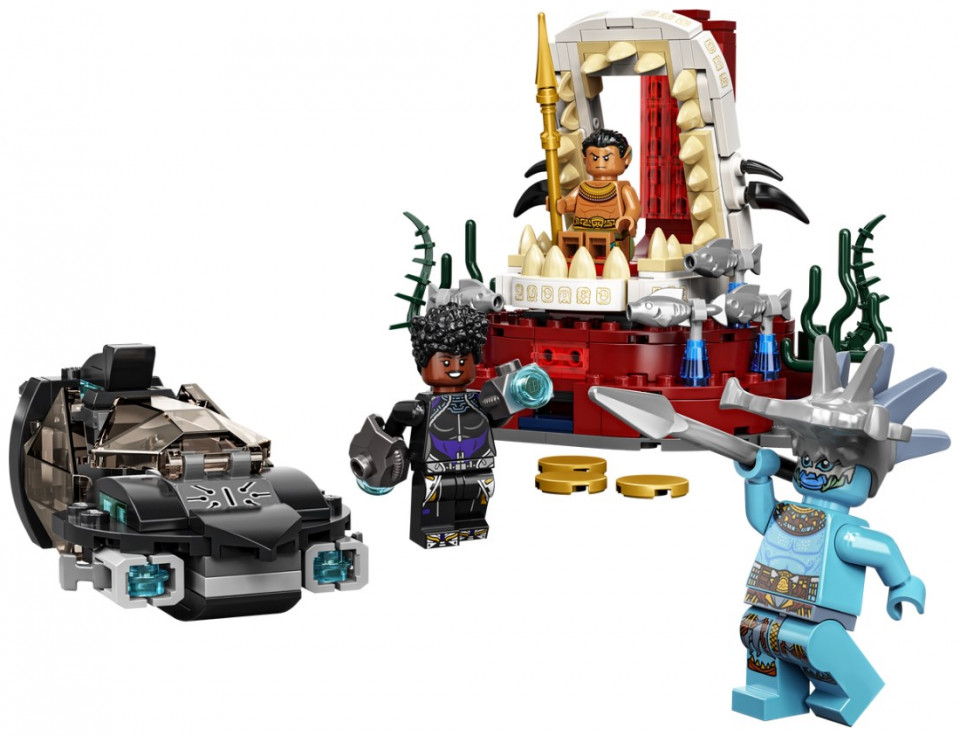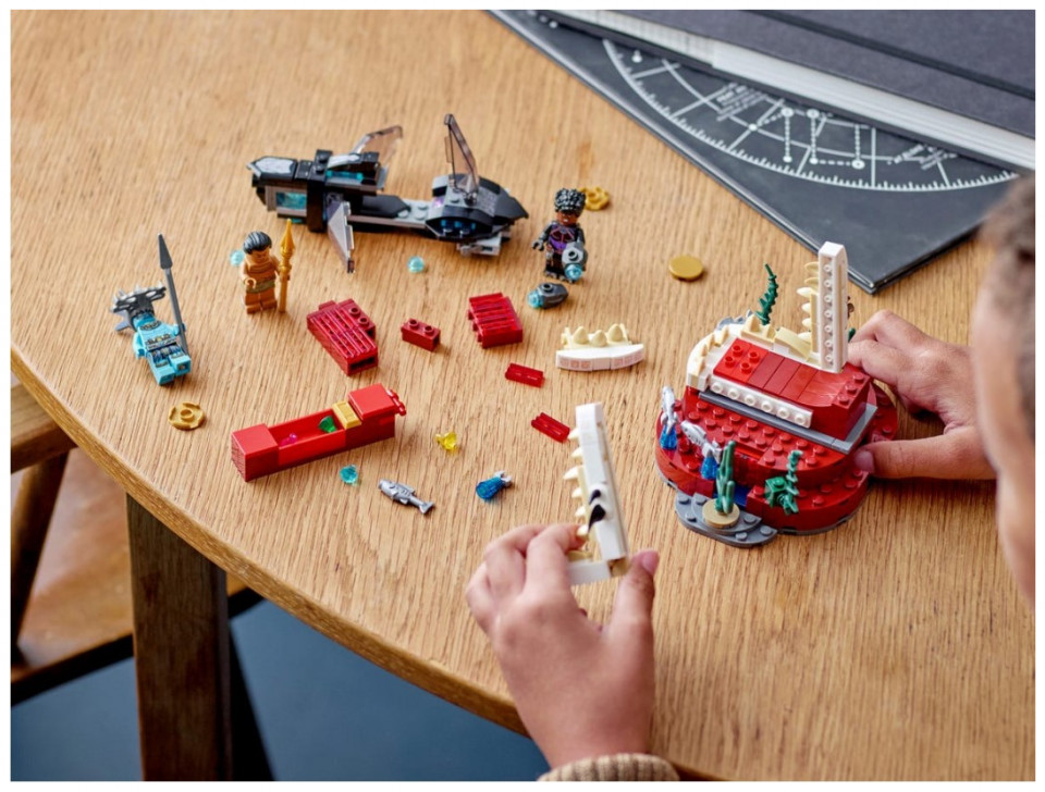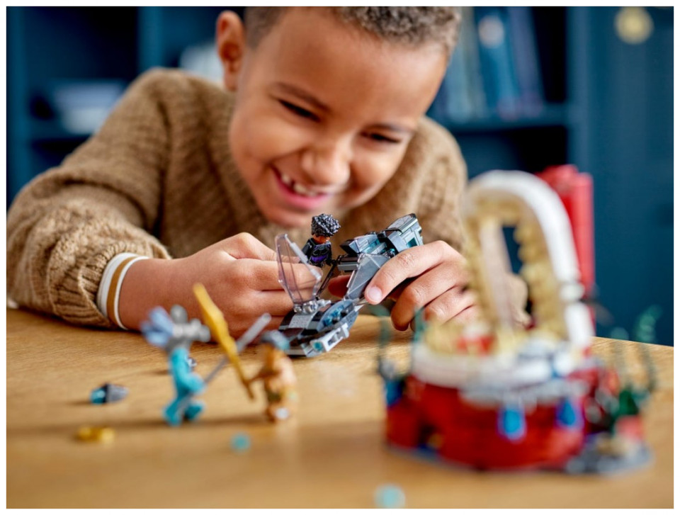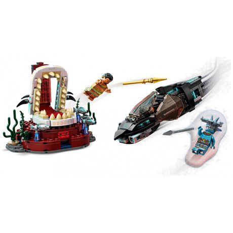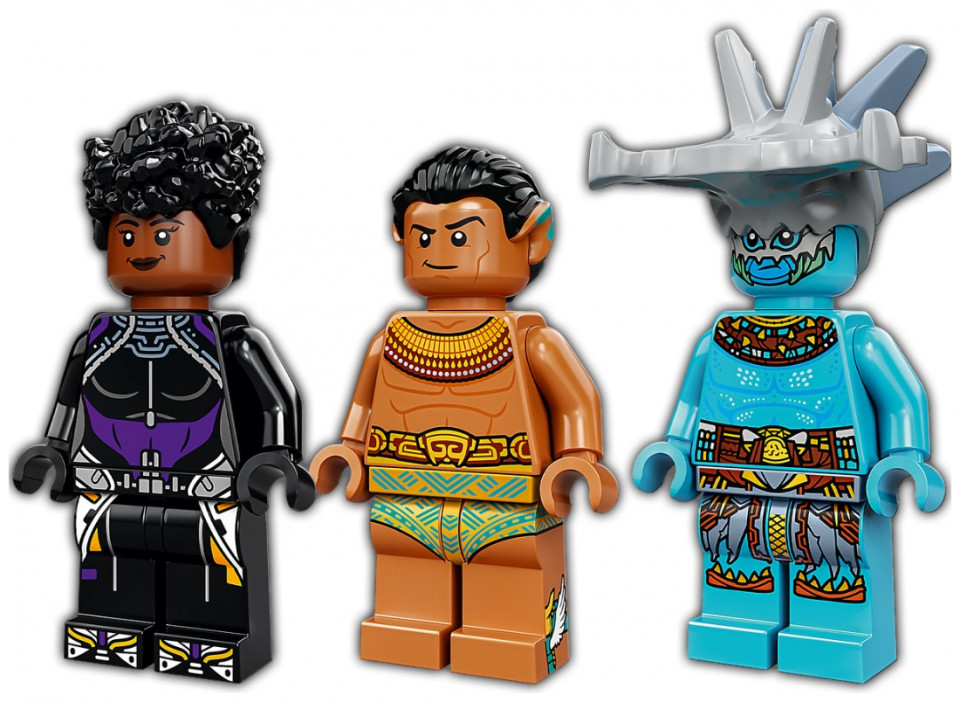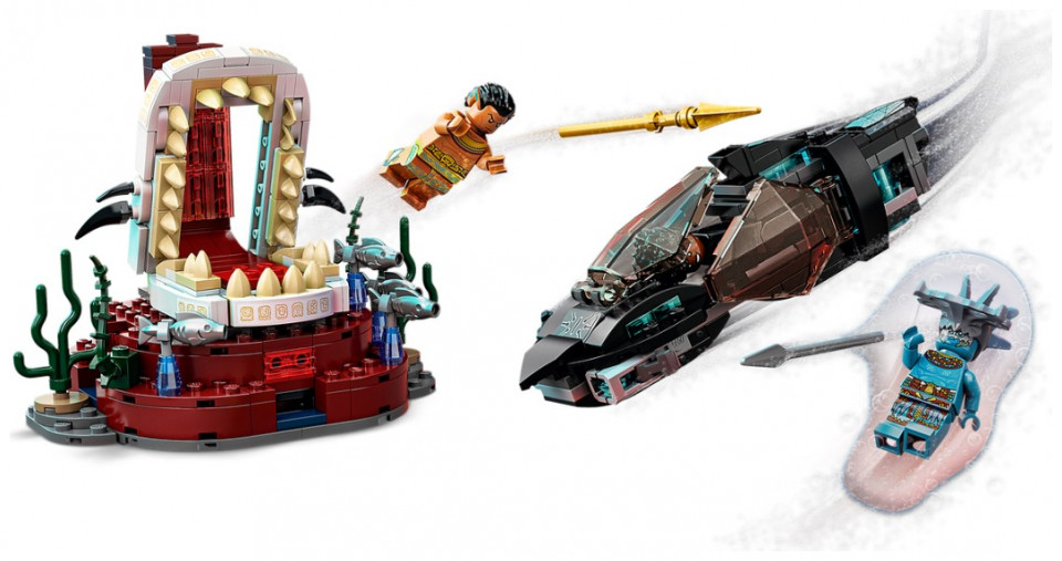 The sleek and stylish recreation of the Skirmisher submarine from Marvel Studios’ Black Panther: Wakanda Forever features stud shooters that kids can fire as they battle the villain Attuma. At the end of the sub’s journey, they’ll discover the Temple of King Namor and the King’s seaweed-decorated throne room. When this mission is over, kids return to the submarine and set off on the next of many more underwater adventures. The set includes 3 minifigures – Shuri, Attuma and King Namor – along with their cool weapons and accessories.