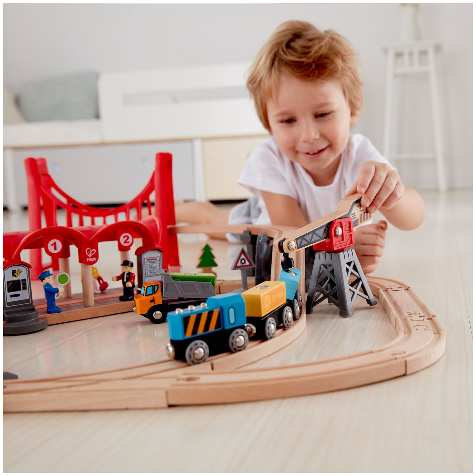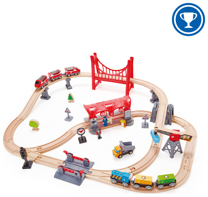 Train tracks aren’t just for passenger trains. There’s freight to deliver, too! This complete city-themed rail set features a passenger and a freight train, a station, automatic gates, a bridge and much more!