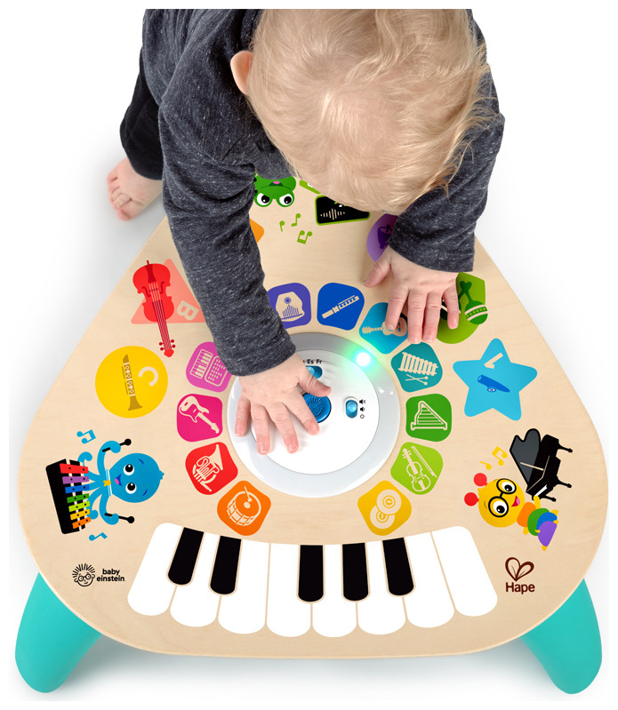 Like the limitless possibilities of music itself, the Clever Composer Tune Table™ Magic Touch™ Activity Toy from Baby Einstein offers open-ended musical experiences for your child. The wooden activity center features award-winning Magic Touch technology to put music at baby’s fingertips. Simply tap the wooden surface to experiment with sound. The 22 instrument options and 3 modes of play encourage your baby to explore and create his own musical compositions. In Learn mode, your little one can discover instrument names, colors and more. Silly mode activates sound effects galore, so the playtime never gets dull. Remove the table legs to create a floor toy for younger babies or little brothers and sisters. With so many ways to play, this musical station will be a family favorite for years to come!
