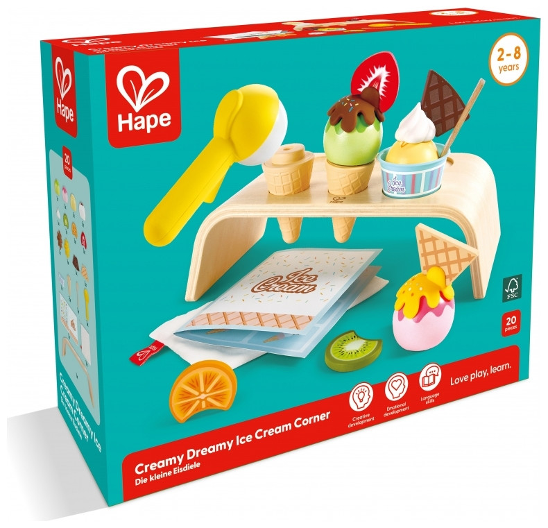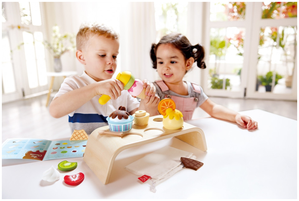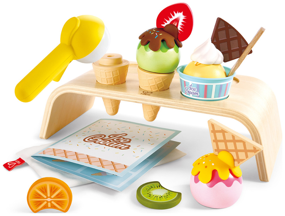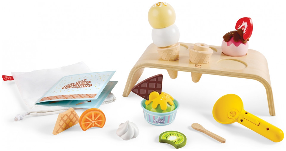 Ο χρόνος για παιχνίδι και παγωτό με φίλους είναι πάντα κατάλληλος! Βουτήξτε σε ένα απίθανο και διασκεδαστικό παιχνίδι με αυτό το όμορφο σετ. Το σετ περιλαμβάνει μια ξύλινη βάση, διάφορες γεύσεις, γαρνιτούρες, φρούτα και μια υφασμάτινη τσάντα. Αυτό το παιχνίδι ενθαρρύνει τη φαντασία των παιδιών και εμπνέει την επιθυμία για παιχνίδι!