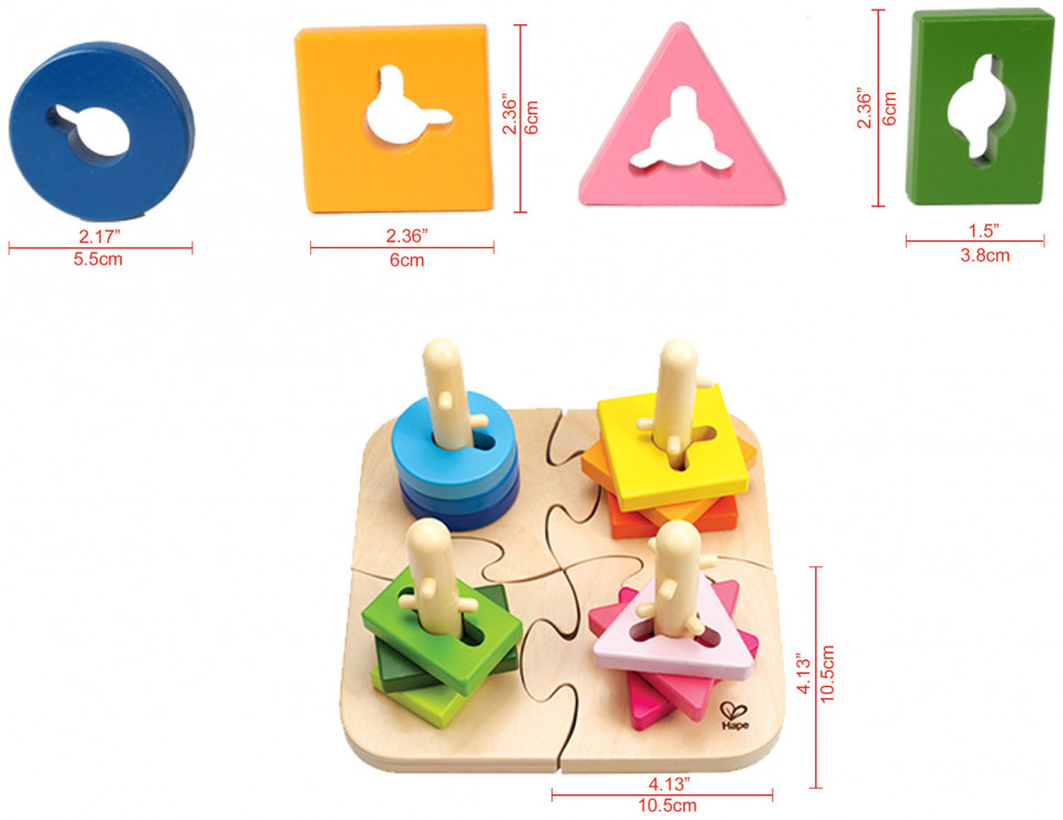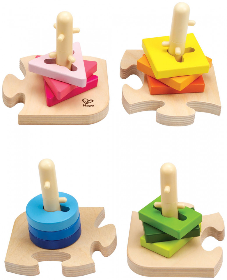 Grooved shapes and pegged posts add an extra dimension of challenge to this colorful puzzle.