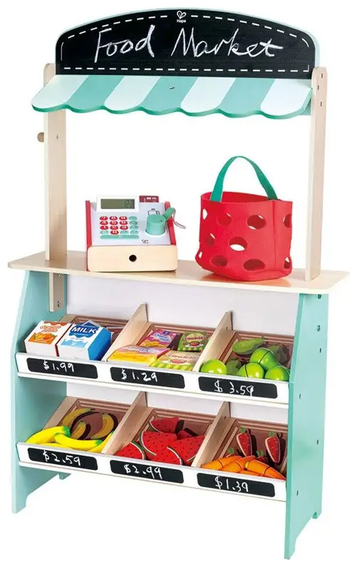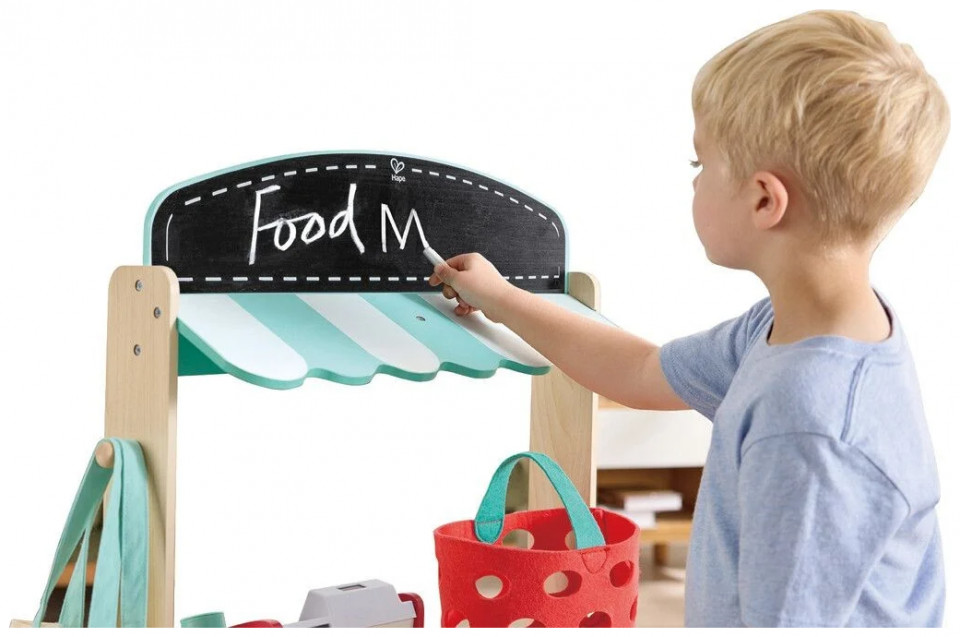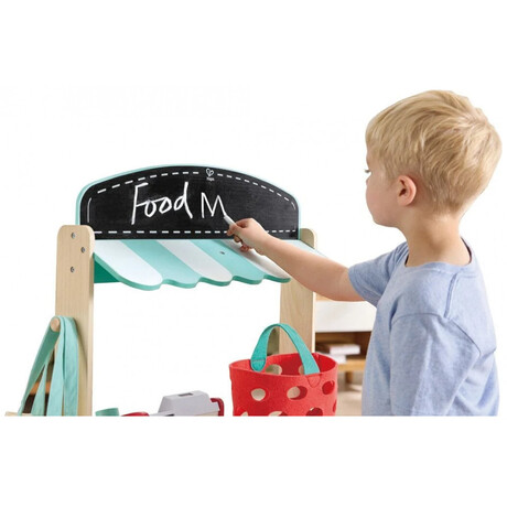 Το σετ Hape Farm Shop Stand περιέχει μια ταμειακή μηχανή που περιλαμβάνει έναν σαρωτή με εφέ φωτός και ήχου. Χώρος έκθεσης δύο επιπέδων, μεγάλος πάγκος, στέγη γαλλικού στιλ, μικρός πίνακας κιμωλίας και μια ταμπέλα καταστήματος που μπορούν να σχεδιάσουν τα παιδιά, καθώς και πολλά αξεσουάρ.