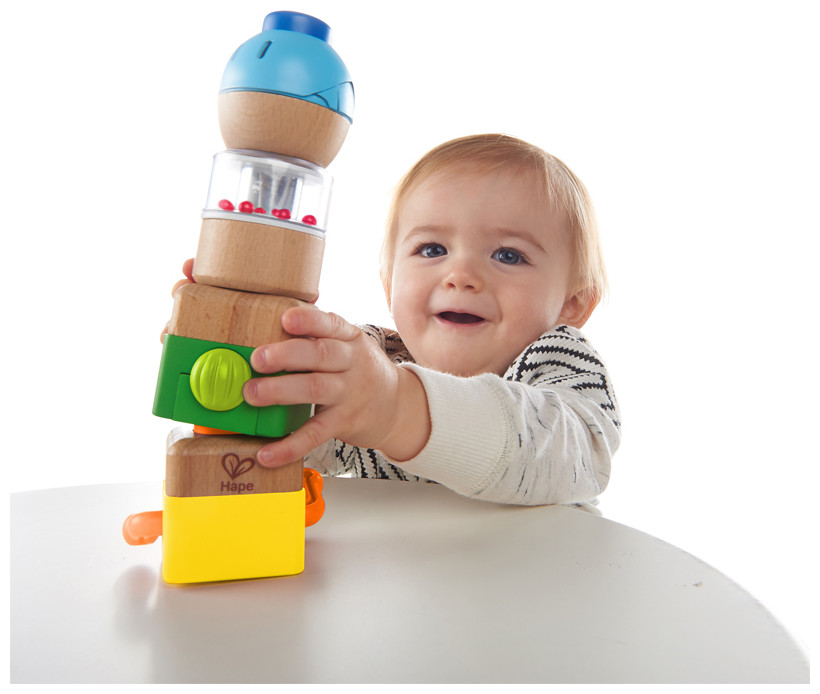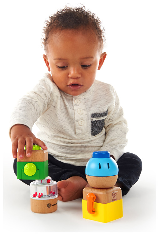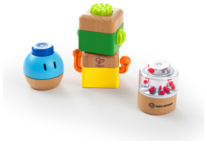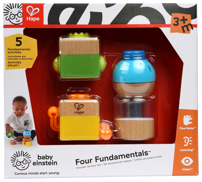 Help baby build the fundamentals of discovery with the Baby Einstein Four Fundamentals Wooden Sensory Set. This stacking wooden block set includes 4 building blocks each meant to engage baby in playful and purposeful ways. The Listening toy squeaks, the Vision toy includes high-contrast patterns for visual development, the Touch toy engages tactile discovery and the Fine Motor Skills toy features little arms to twist and turn. Baby will love stacking, twisting, touching and spinning the toys in this multisensory wooden block set.