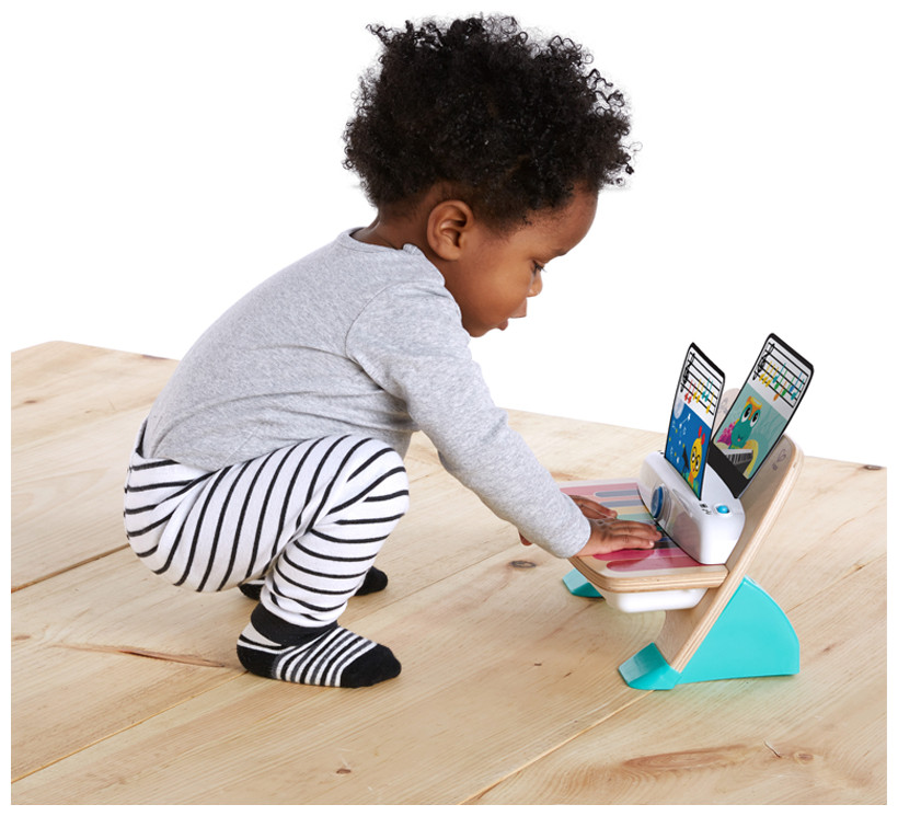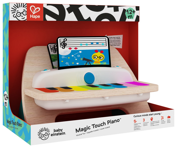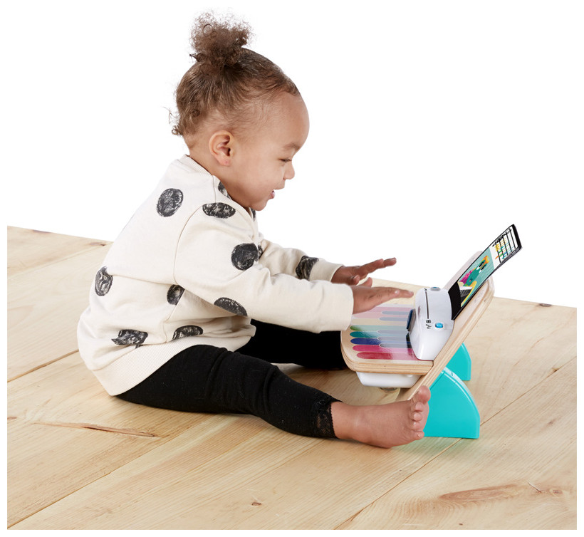 With the delicate touch of her little fingers, Baby Einstein and Hape’s Magic Touch Piano will let baby create thousands of different songs. Made from wood, this piano toy features magic touch technology – no buttons or keys needed! Two modes of play give your toddler the ability to make her own music or play along with classic melodies. Giving your baby toys that make music helps her tune into different rhythmic patterns and sounds at a young age. This musical development toy comes with 3 sheets of music. She’ll practice color coordination by matching the color-coded notes on the sheets to the keys on her piano. But this toddler toy isn’t just for kiddos — join her at the piano bench to have just as much fun! And don’t worry about waking little brother or sister. The volume control buttons let you turn the music to “low” when you need to, or crank it up to “high” for a main-stage piano performance. At either volume, the higher end quality speakers make sure your baby’s sonata sounds just right.