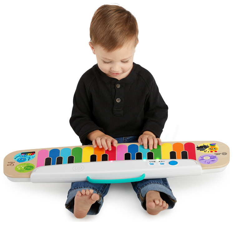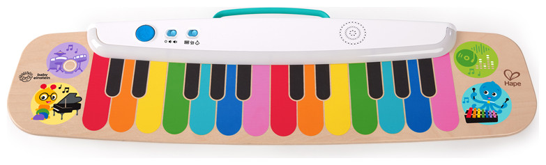 Give baby the keys to music appreciation and creative expression with the Notes & Keys™ Magic Touch™ Keyboard from Baby Einstein. Made with award-winning Magic Touch technology, this wooden toy puts music at baby’s fingertips… with no buttons or keys required! The portable design of this keyboard toy makes it easy to bring self-expression wherever you go, and it stows neatly away when not in use. The musical possibilities are endless in Freeplay mode, and baby can switch between piano, xylophone, hip hop and drum sounds. Our Play Assist technology helps baby discover a new song by following the lights, and Silly Mode activates sound effects galore. This developmental toddler toy introduces color and music notes while exploring cause and effect through sound. Your budding musician will be amazed at the way their fingers or toes can make music happen with just a tap!