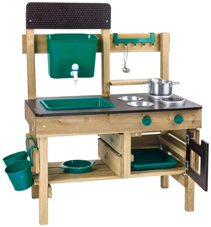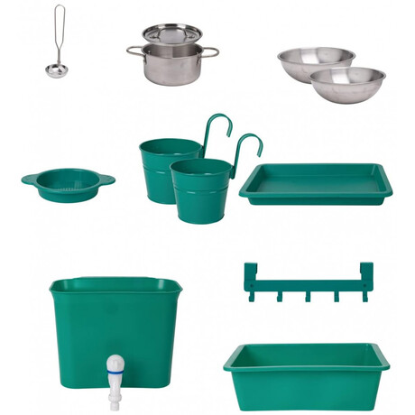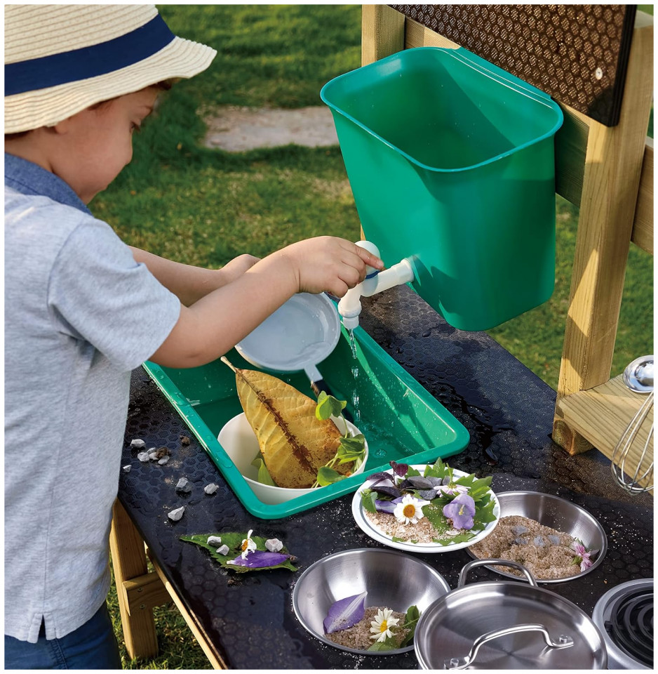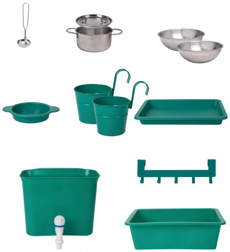 GREAT OUTDOOR KITCHEN PLAYSET: Preschoolers can’t wait to get their little hands on these cute accessories: a pot, ladle, two bowls, two flowerpots, a sieve, water tank, sink, faucet and oven plate. The perfect backyard toy for a busy kid