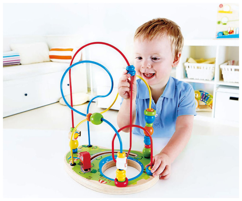 Over, under, around and through. Wooden beads, rings and winding paths create endless ways to play.