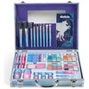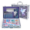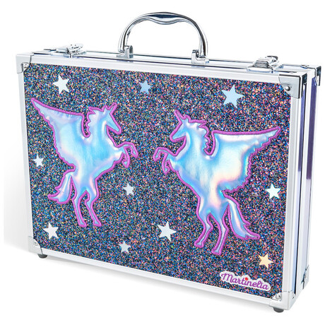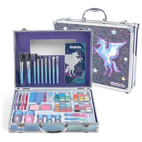 Βαλιτσάκι με ασημένιες μεταλλικές λεπτομέρειες που περιλαμβάνει 1 παλέτα σκιών 4 αποχρώσεων, 4 Lipstick, 3 βερνίκι νυχιών, 4 Lip Gloss, 2 ρουζ, 2 μολύβια ματιών, 2 μολύβια χειλιών, 2 Body Glitter και 9 πινέλα.