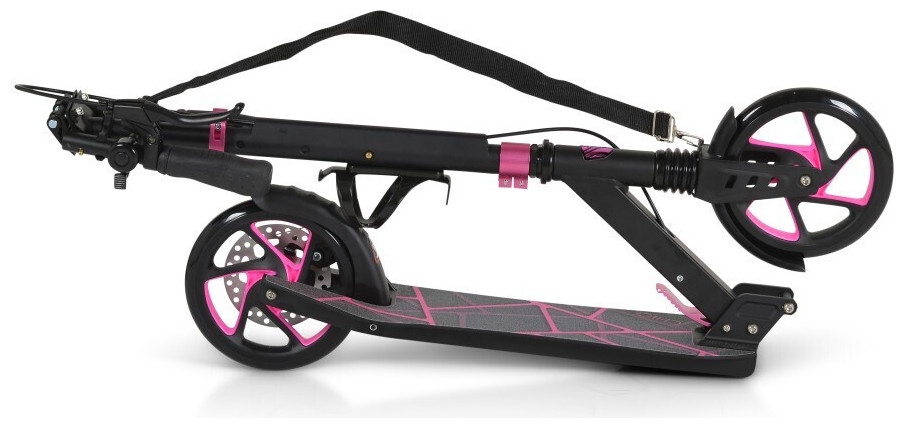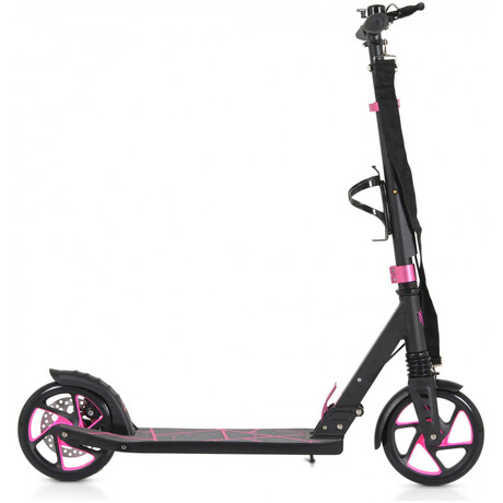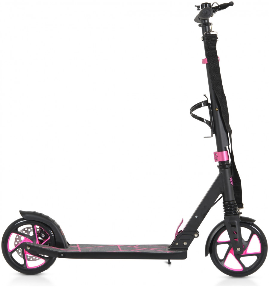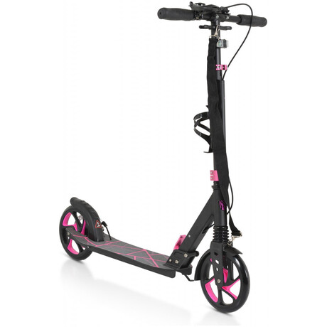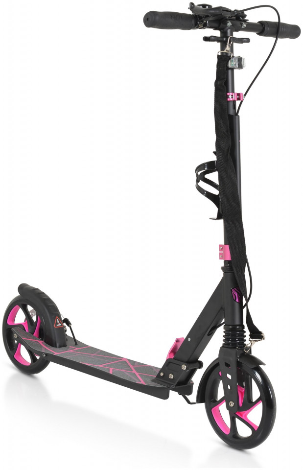 Aluminum folding scooter with rear disc brake; PU wheels with size 200*30 mm and ABEC-7 bearings; Front shock absorber; Side stand; Adjustable handlebar height from 90 to 104 cm; NBR ergonomic handles with a length of 12 cm; Stepping base size 545*150 mm with anti-slip coating. The scooter is equipped with a carrying belt, a bell, a water bottle holder and a front LED light. Maximum load up to 100 kg. For children over 8 years old.