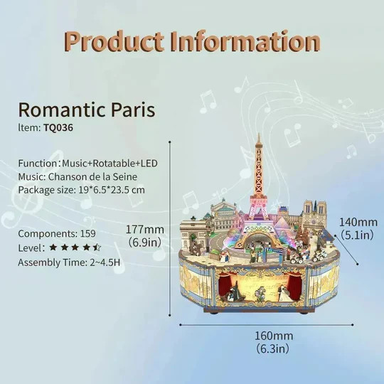 Ζήστε τη μαγεία του Παρισιού με το DIY Kit "Romantic Paris" από την Tonecheer. Δημιουργήστε ένα εντυπωσιακό μουσικό κουτί 159 κομματιών, με LED φωτισμό και ρομαντική ατμόσφαιρα, ιδανικό για διακόσμηση ή δώρο.