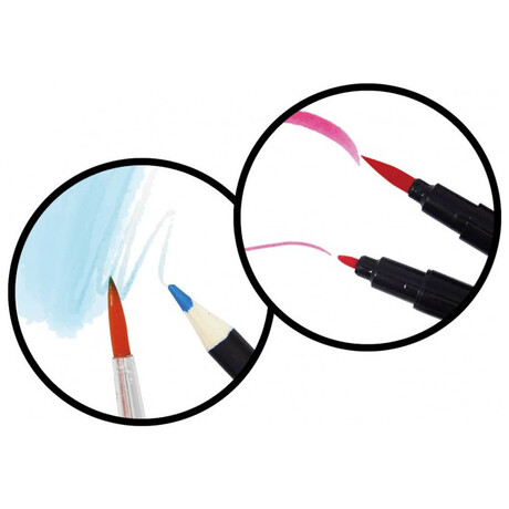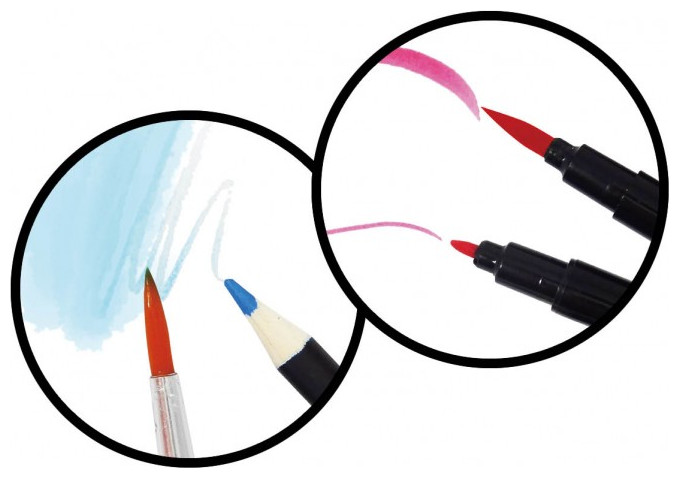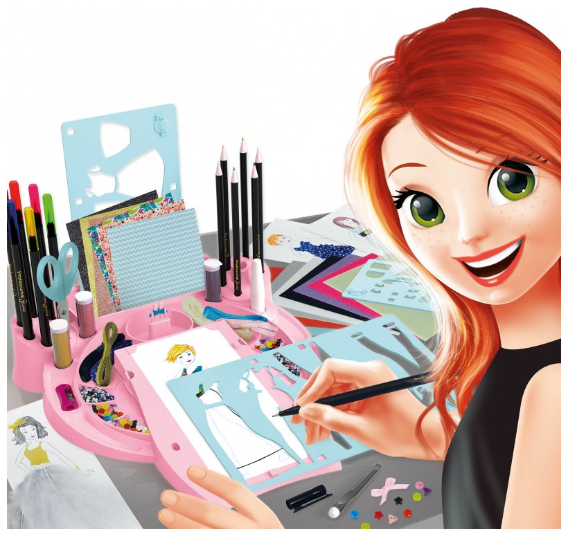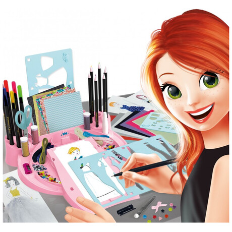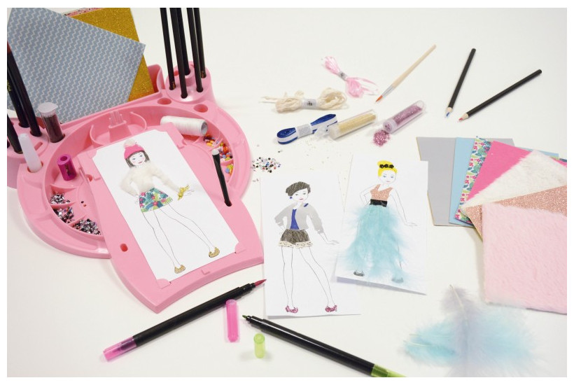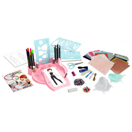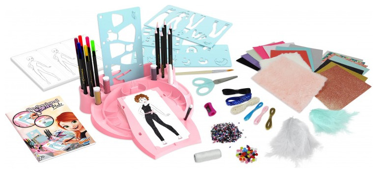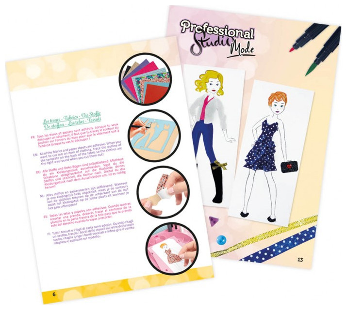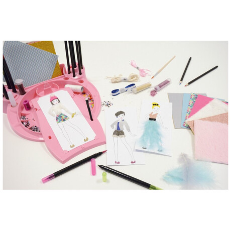 Τοποθετήστε μια φιγούρα, σχεδιάστε ρούχα με τα διάτρητα φύλλα και μετά γεμίστε τα χρησιμοποιώντας τα πολλά διαφορετικά αξεσουάρ που περιλαμβάνονται: αυτοκόλλητο ύφασμα, φτερά, γκλίτερ, τσόχα, κορδέλες, μαρκαδόρους, μολύβια ακουαρέλας, ψαλίδι, ξύστρα και άλλα .
