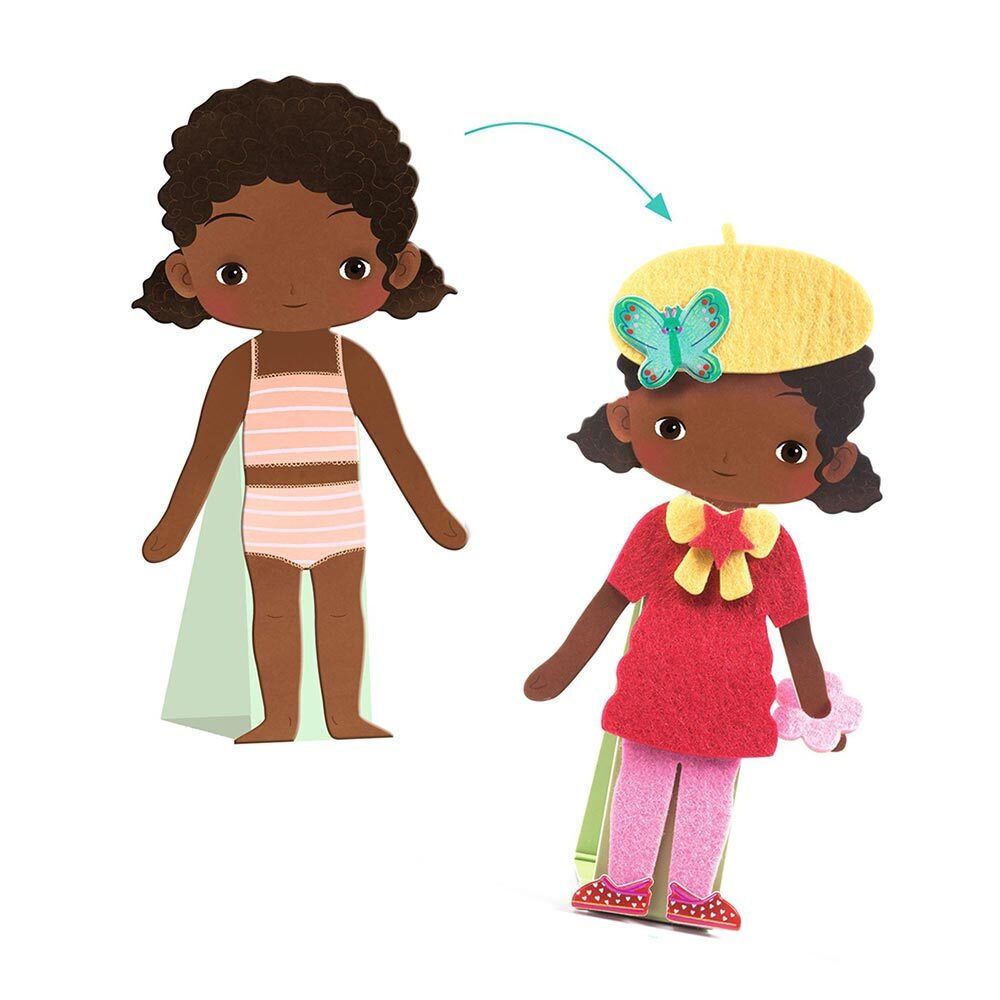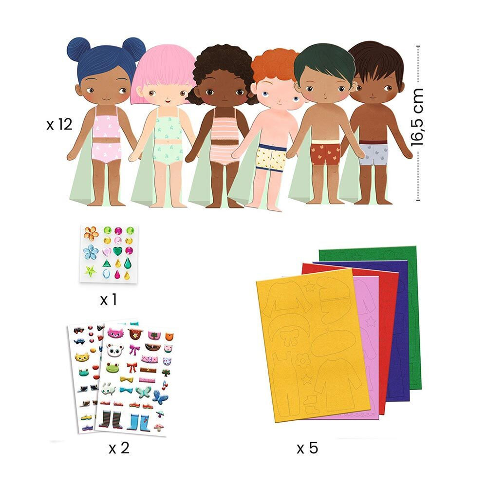Τα παιδιά μπορούν να συνδυάζουν ρούχα και αξεσουάρ, δημιουργώντας διαφορετικά σύνολα ξανά και ξανά, χάρη στα μαλακά αυτοκόλλητα από τσόχα που αφαιρούνται και επανατοποθετούνται εύκολα.