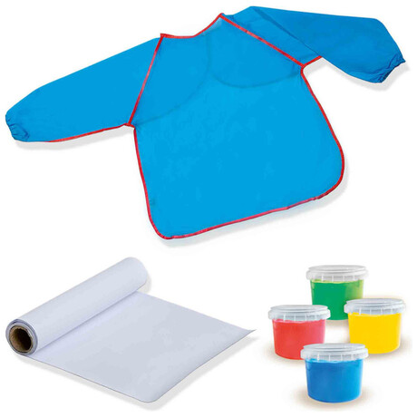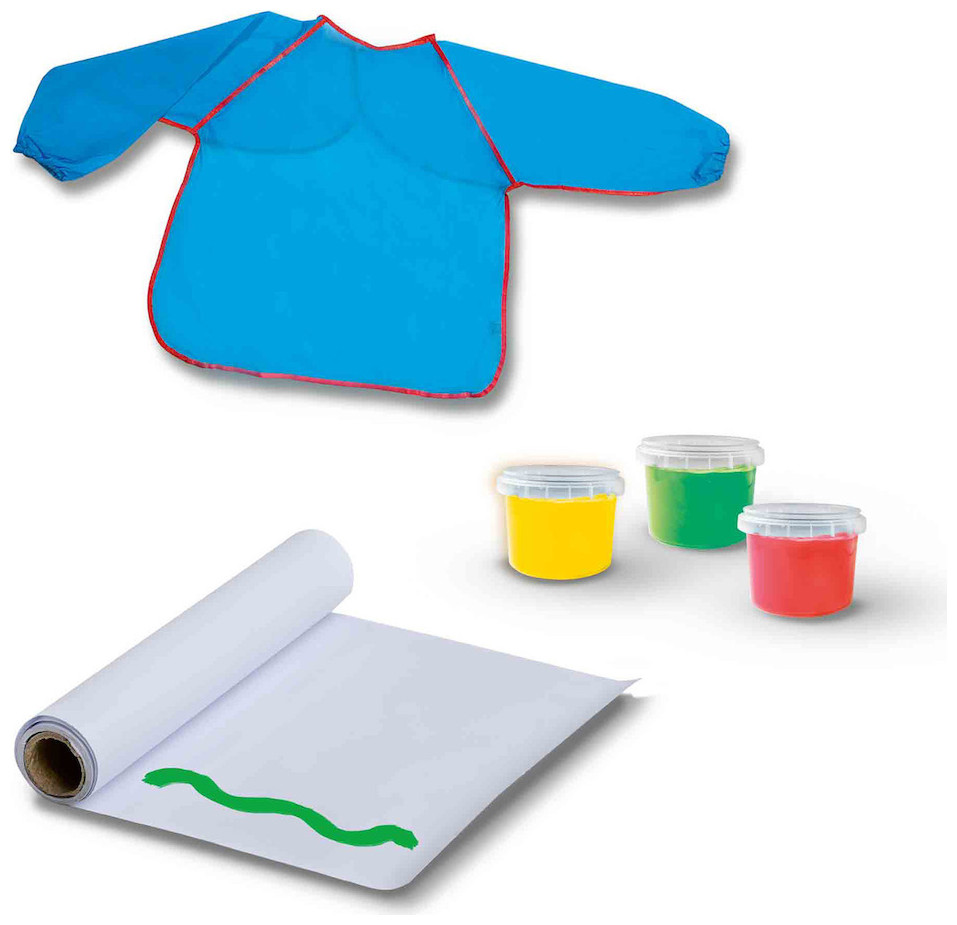 • Περιέχει: 4 χρώματα μπογιάς για ζωγραφική με τα δάχτυλα; κίτρινο; κόκκινο; μπλε; πράσινο; ποδιά; ρολό χαρτιού (2 μέτρα).
