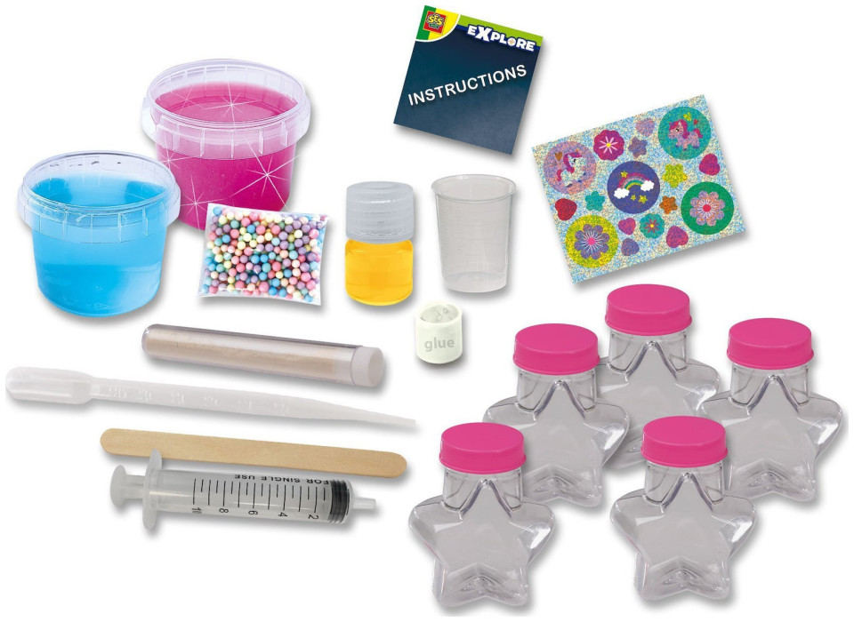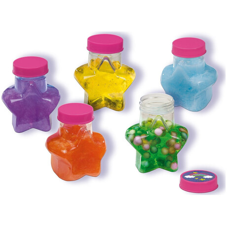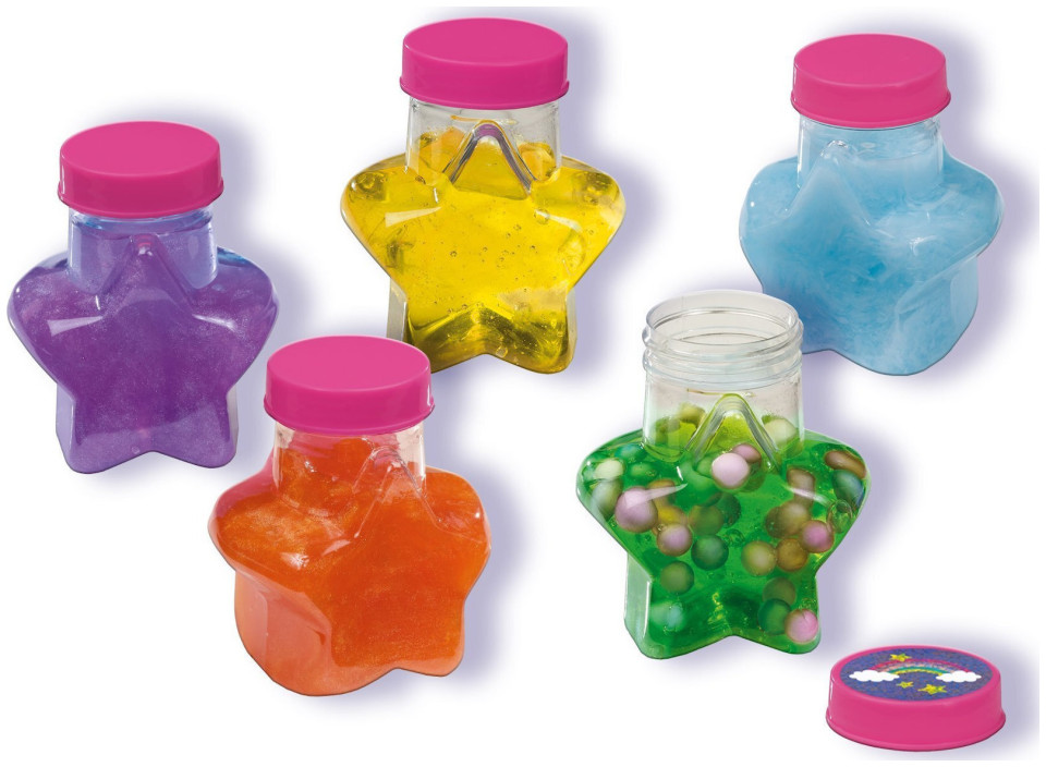 • Αυτό το σετ χειροτεχνίας περιλαμβάνει ροζ γκλίτερ λάσπη, μπλε διαφανή λάσπη, σκόνη λάσπης, κίτρινη βαφή και πέντε μπουκάλια αποθήκευσης σε σχήμα αστεριού για μια ολοκληρωμένη εμπειρία παρασκευής λάσπης.