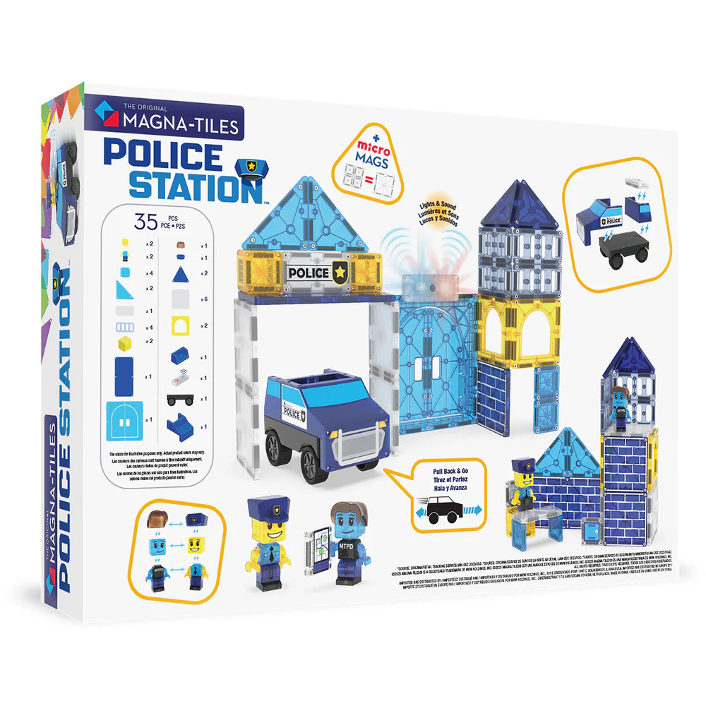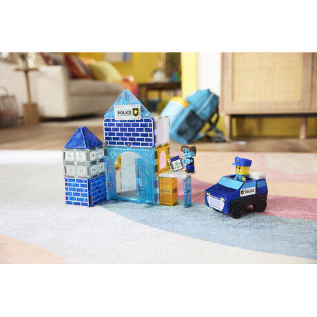 Το Magna-Tiles Police Station είναι ένα δημιουργικό μαγνητικό παιχνίδι κατασκευών που επιτρέπει στα παιδιά να δημιουργήσουν τον δικό τους αστυνομικό σταθμό και να ζήσουν συναρπαστικές ιστορίες δράσης. Με 35 μαγνητικά κομμάτια, τα παιδιά μπορούν να κατασκευάσουν κτίρια, πύργους και χώρους στάθμευσης για τα οχήματα της αστυνομίας, αναπτύσσοντας τη φαντασία και τη δημιουργικότητά τους. Οι ισχυροί μαγνήτες επιτρέπουν εύκολη σύνδεση των κομματιών, δημιουργώντας σταθερές κατασκευές και ενθαρρύνοντας το εκπαιδευτικό παιχνίδι μέσα από δραστηριότητες STEM.