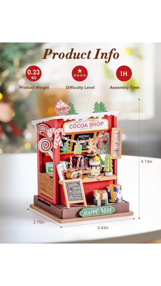 Το Robotime Rolife Cocoa Shop DS042 συνδυάζει την αγάπη για τις γλυκές απολαύσεις με τη χαρά της δημιουργίας, δημιουργώντας μια χαριτωμένη και ατμοσφαιρική μινιατούρα που θα στολίσει τον χώρο σας και θα ενθουσιάσει μικρούς και μεγάλους.