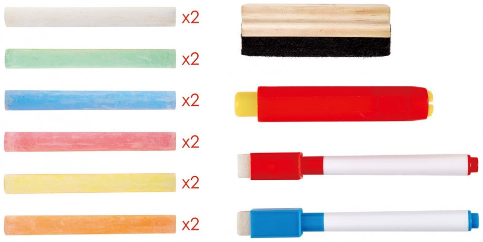Περιλαμβάνει 12 κιμωλίες διαφορετικού χρώματος, δύο μαρκαδόρους, μία θήκη κιμωλίας και μία λάστιχο σανίδας.