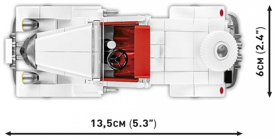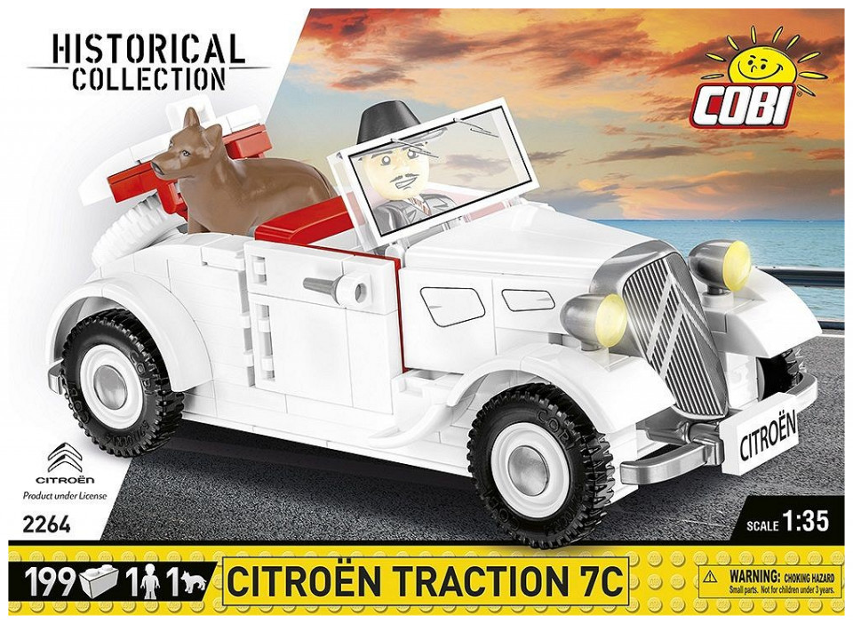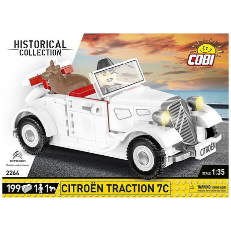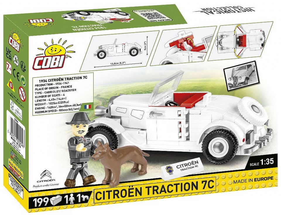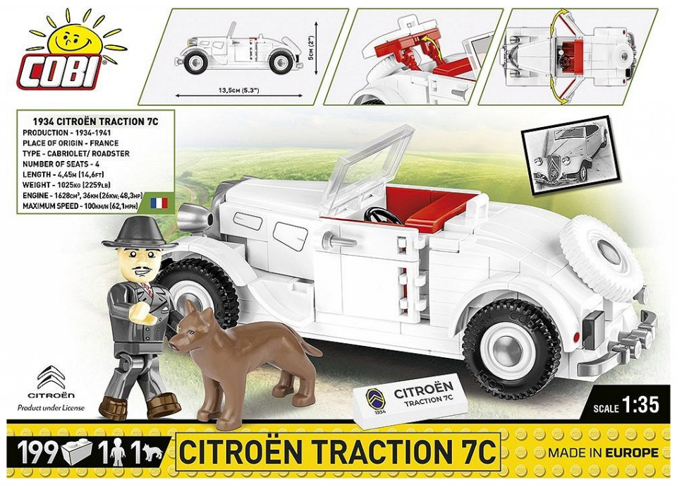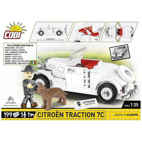 The Citroen Traction 7C Cabriolet was designed in the sensational scale of 1:35. It is another set honoring the history of the automotive industry! The use of elements specially designed for the needs of vehicles makes COBI models very attractive and helps them feature many surprising details. Particularly noteworthy are precise prints in place of the stickers used in the past. The Citroen Traction is a convertible which, thanks to the trunk that can be opened, also has a cleverly positioned seat. The unique light color of the body, used for the first time, perfectly enlivens the collection of historic cars. The set includes a figure of the owner of the vehicle with a dog. The whole set is complemented by a brick with the name of the vehicle and the historic Citroen logo. 199 elements and intuitive instructions are a recipe for a simple and pleasant construction process. The model is aimed at automotive enthusiasts of all ages. It can become an exhibit of an adult collector and decorate a young person's room. More experienced COBI builders will certainly want to modify the vehicle further on their own. Build history, piece by piece.