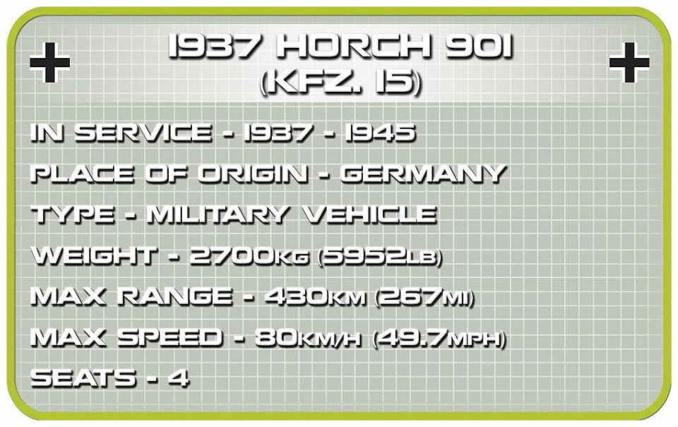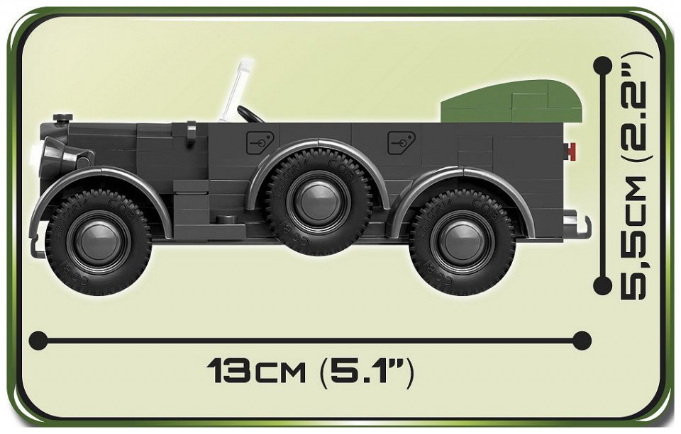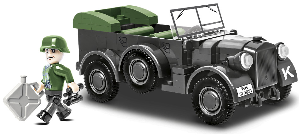 The staff car is the ideal accessory for building scenes and historical dioramas reproducing any European front of the Second World War. It will make a great gift regardless of the age of the recipient. It will also please adult collectors and automotive enthusiasts and children. The Horsh 901 is a great start to start your adventure with Polish COBI building blocks.