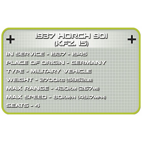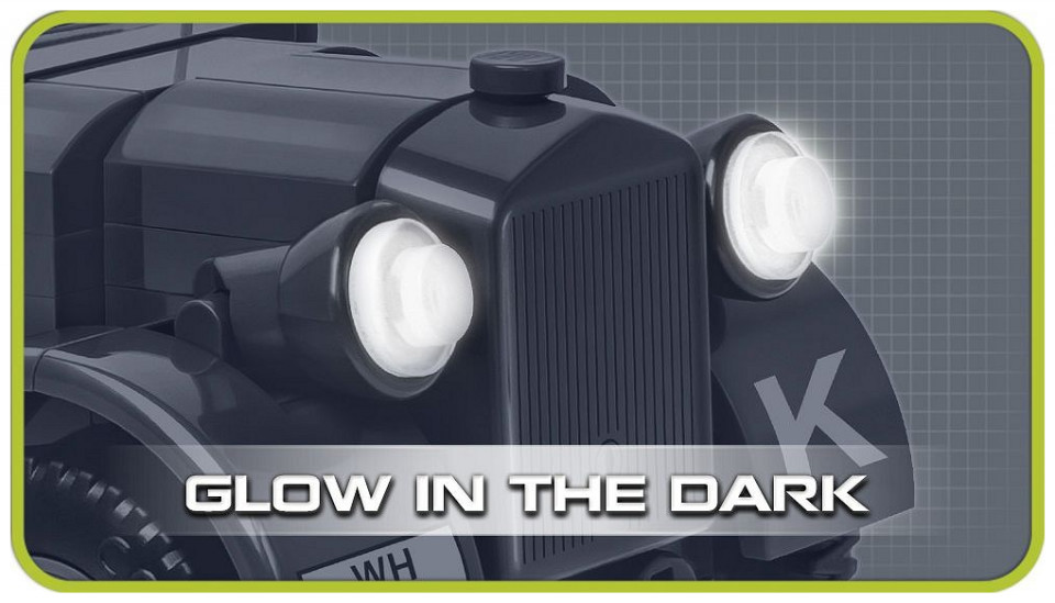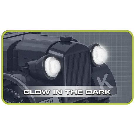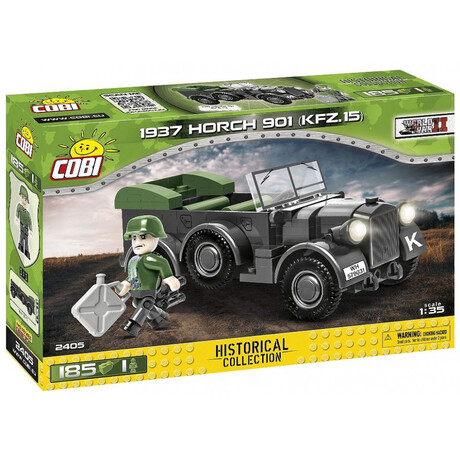 From the set of 185 COBI building blocks you can build the military passenger-terrain car Horch 901 (Kfz.15). All graphic details are high-quality prints that do not smear or scratch, even during intense play. The design is also remarkable and, in a unique way, reflects the original shapes of its historical inspiration. The model surprises with new types of blocks, which are excellent for the construction of cars and facilitate further rework and design of your own creations. A figure of a German driver equipped with binoculars is included with the detailed vehicle. The whole set is topped off by a plate with the name of the vehicle.