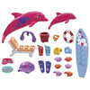Γεμίστε το δοχείο με ζεστό νερό, τοποθετήστε μέσα την κούκλα και στρφογυρίστε την για να αποκαλύψετε την εμφάνισή της. Μετά, βυθίστε το σφουγγάρι σε παγωμένο νερό για να μεταμορφώσετε την εμφάνισή της Τοποθετήστε τα υπόλοιπα αντικείμενα στο ζεστό νερό και αποκαλύψτε περισσότερες εκπλήξεις. Φτιάξτε το σκάφος με τη βάση Color Reveal™ για να ανακαλύψετε ψάρια και τοποθετήστε και τις δύο μικρές κούκλες μέσα για να ξεκινήσετε την εξερεύνηση. Έπειτα, φτιάξτε τους κρίκους για να μάθετε κόλπα στα δελφίνια. Όταν έρθει η ώρα να χαλαρώσετε, φτιάξτε την καλύβα στην παραλία και διασκεδάστε στον ήλιο.