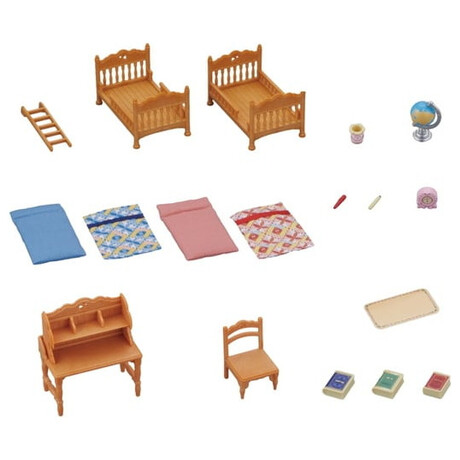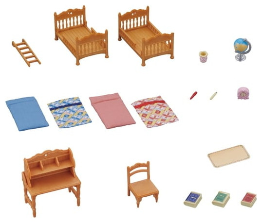 ed x2, Ladder, Mattress x2 (Blue, Red), Bedding x2 (Blue, Red) , Child's Desk, Chair, Shelf, Mat, Pencil, Red Pen, Pen Stand, Desk Clock, Book x3, Globe (a total of 19 pieces)