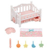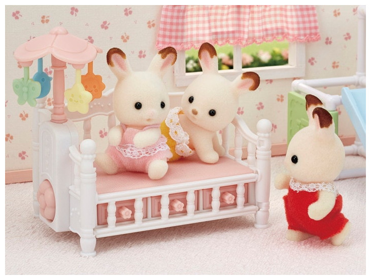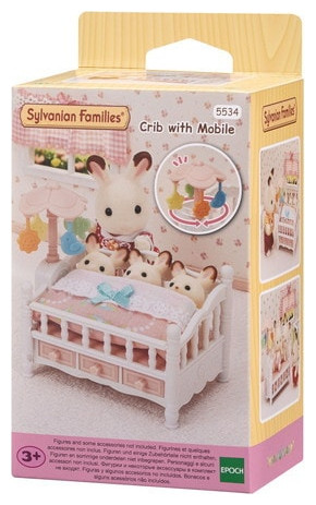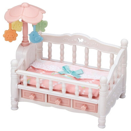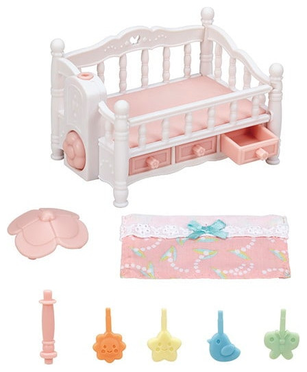 The Crib with Mobile set comes with a cute crib that sleeps triplets (cradled babies) side by side. Turn the flower dial on the side of the bed to make the mobile spin.