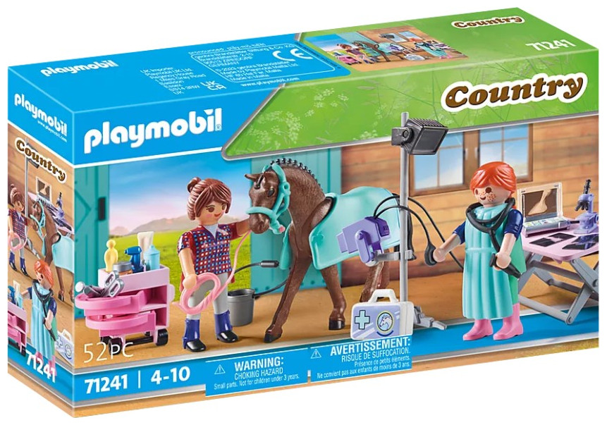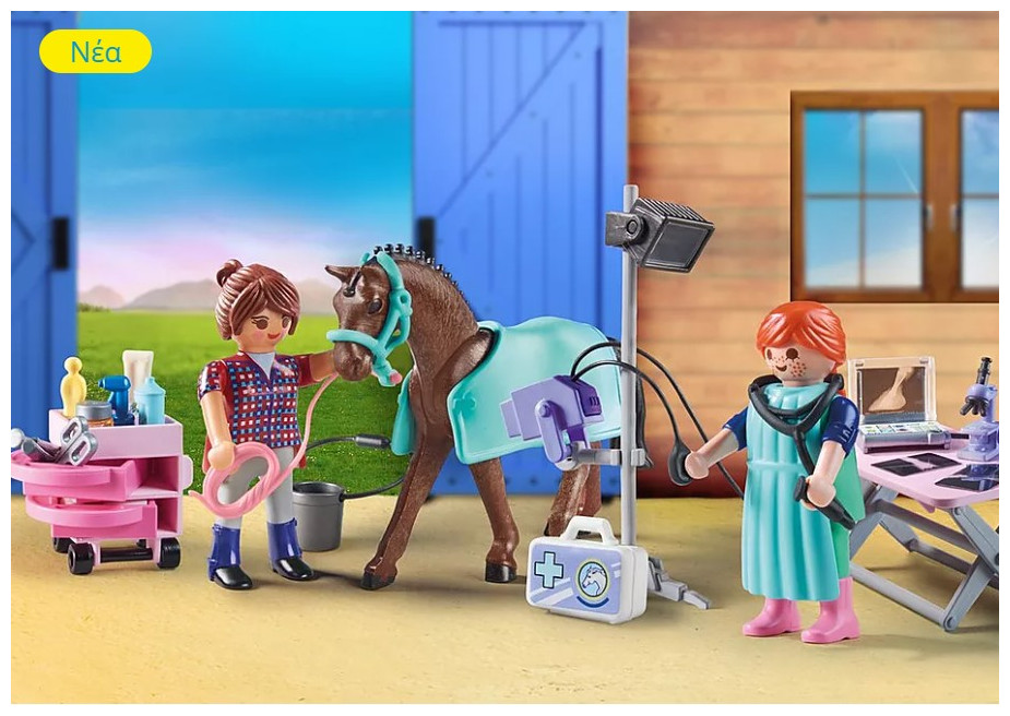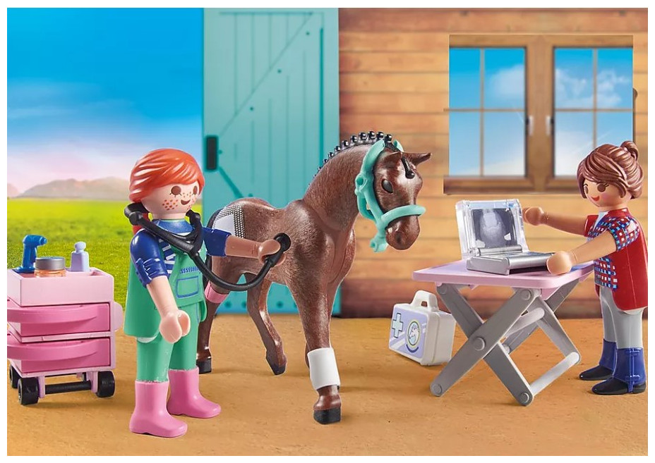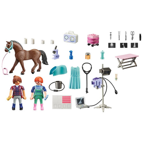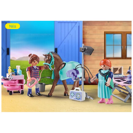 Επιπλέον πληροφορίες: Το σετ παιχνιδιού περιλαμβάνει δύο φιγούρες PLAYMOBIL, ένα άλογο, ένα ακτινογραφικό μηχάνημα, γραφείο με υπολογιστή, μικροσκόπιο και όλο 6τον απαραίτητο ιατροφαρμακευτικό εξοπλισμό για τη φροντίδα του αλόγου.