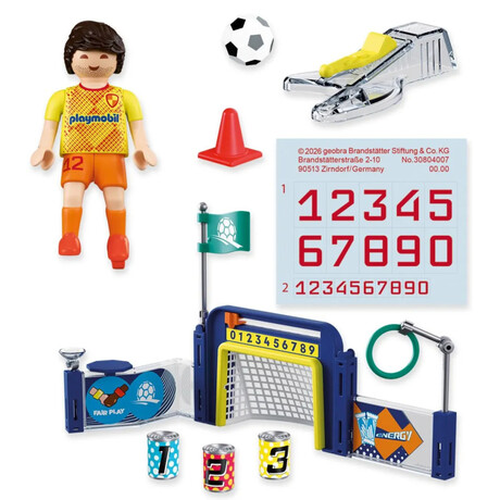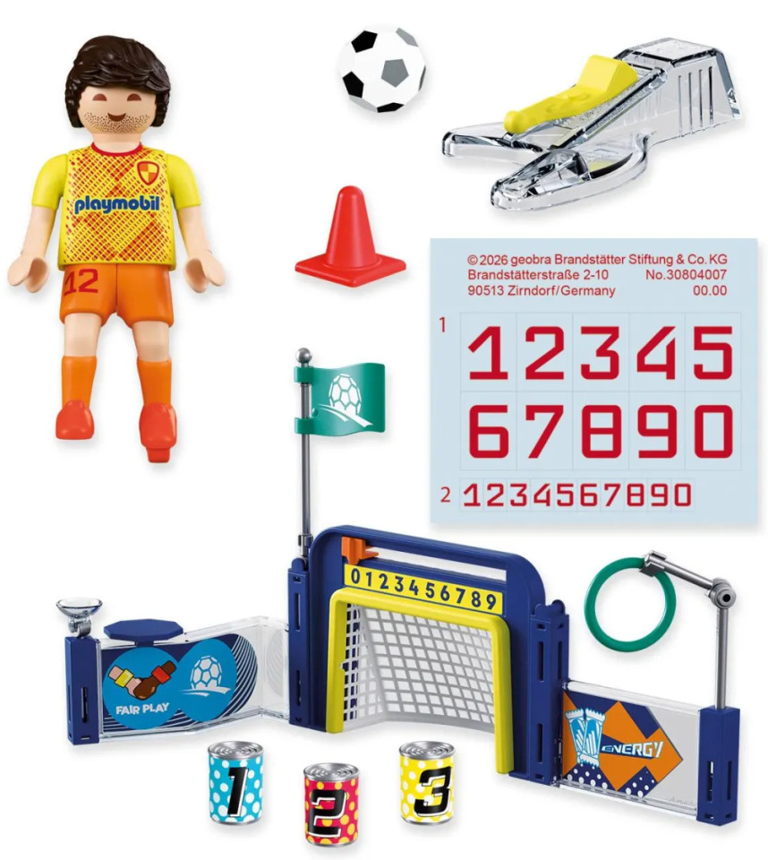 Η φιγούρα PLAYMOBIL σουτάρει και σκοράρει: απλώς τραβήξτε το πόδι πίσω, στοχεύστε - και σουτάρετε! Τα γκολ που σημειώνονται μπορούν να παρακολουθούνται χρησιμοποιώντας τον μετρητή τερμάτων πάνω από το φιλέ. Με το παρεχόμενο φύλλο αυτοκόλλητων, τα παιδιά μπορούν να εξατομικεύσουν τον ποδοσφαιριστή τους με τον δικό τους αριθμό φανέλας.