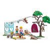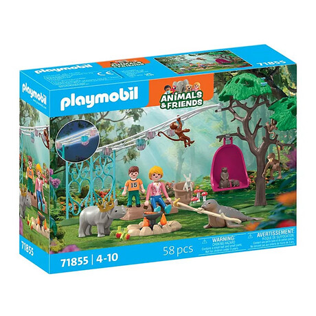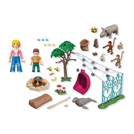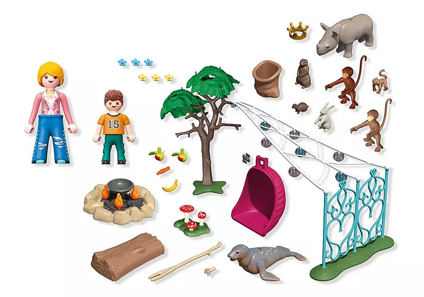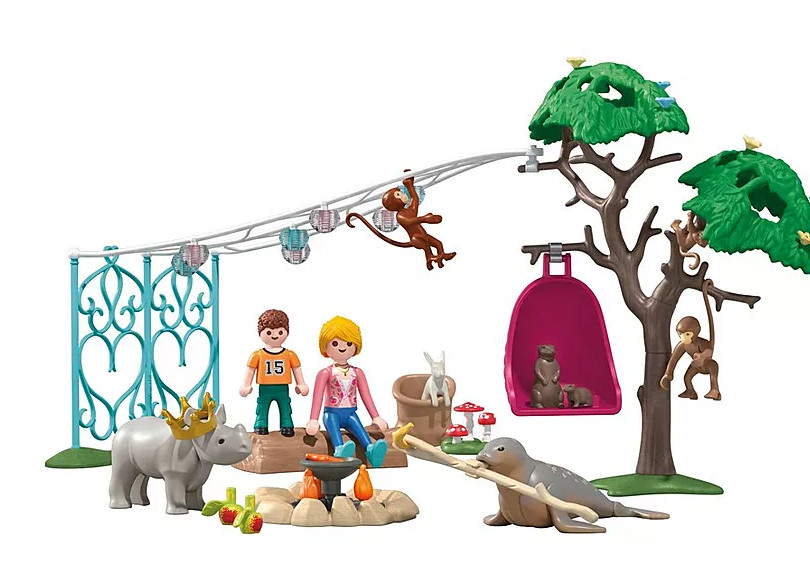 Ώρα για γιορτή! Όλοι μαζεύονται κάτω από τη γιρλάντα που φωσφορίζει για παιχνίδι, μουσική και λιχουδιές. Η περιστρεφόμενη αιώρα είναι το αγαπημένο σημείο για ζώα και επισκέπτες, ενώ μια μπανάνα μπορεί να κρεμαστεί στο κλαδί – ιδανική για ψήσιμο στη φωτιά. Με άνετα καθίσματα γύρω από τη φωτιά, κάθε λεπτομέρεια συμβάλλει στη χαρούμενη ατμόσφαιρα. Το σετ περιλαμβάνει γλυκά ζωάκια, διασκεδαστικά αξεσουάρ και ό,τι χρειάζεται για φανταστικά γενέθλια – μέρα ή νύχτα!
