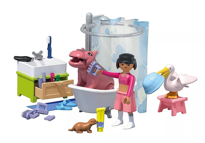 Χαρούμενα πλατσουρίσματα – το μπάνιο γίνεται πιο γλυκό από ποτέ! Το μωρό ιπποπόταμος χαλαρώνει πίσω από την κουρτίνα, ενώ ο πελεκάνος κρατά μια πετσέτα στο ράμφος του! Το σαμπουάν, το σαπούνι και τα υπόλοιπα αξεσουάρ μπαίνουν εύκολα στο έπιπλο ή στο καλάθι. Ακόμα και η βίδρα είναι έτοιμη για φυσαλίδες και παιχνίδι! Το σετ προσφέρει αξέχαστες στιγμές γεμάτες φροντίδα και γέλιο. Συνδυάστε το με την Έπαυλη των Animals & Friends (κωδικός: 71852) για ακόμα περισσότερη διασκέδαση!